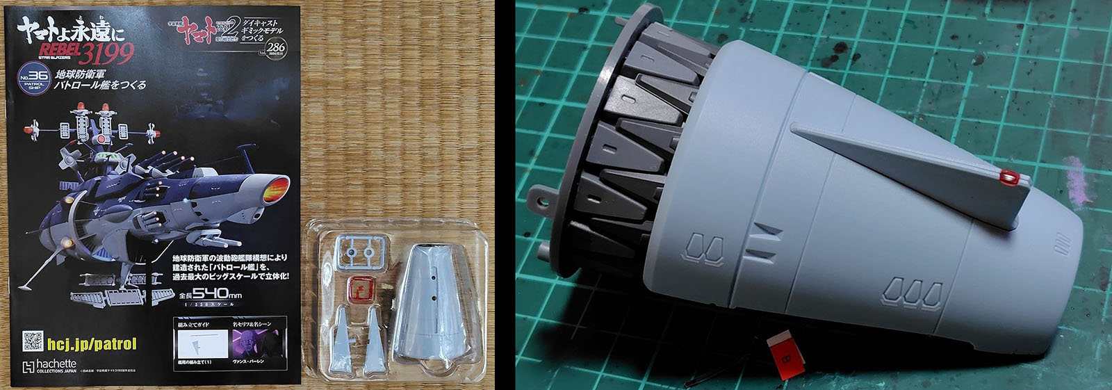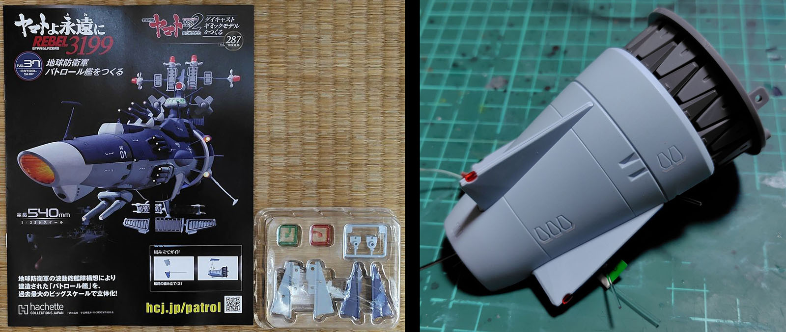 Progress was slight this week, since the only new parts were stabilizer fins (and their lights) to be attached to either side of the rear hull segment. As of now, there were 23 more volumes to completion.