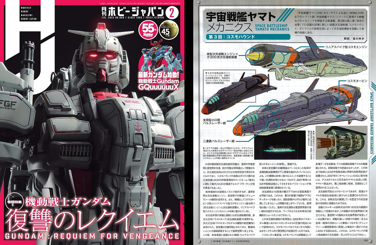 The last issue of the year offered five pages of coverage, four dedicated to the new 3199 model kit and another for part 3 of the ongoing Yamato Mechanics series, this time spotlighting the Cosmo Hound.
