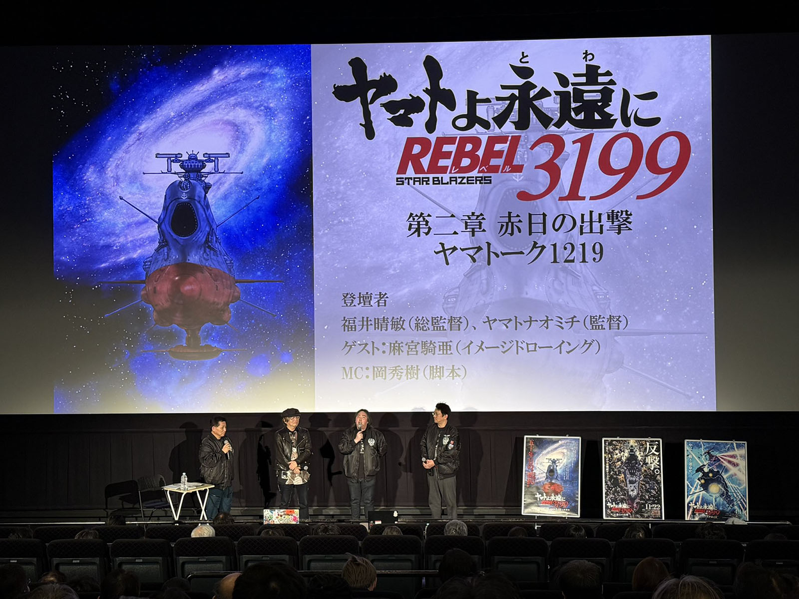 At the conclusion of its 4th week, REBEL 3199 Chapter 2 cycled out of most theaters, but was held over for a 5th week at four of them. This included the Shinjuku Piccadilly, where week 5 began with Yamatalk 1219 (named for the calendar date). What made it special? This time, the regular trio was joined by artist Kia Asamiya and everyone got a look at some never-before-seen concept drawings on the big screen.