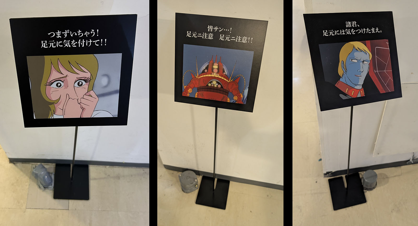 The first “caution” sign was seen at the end of this room. Three of these were spread around near floor fixtures with each character saying some version of “watch your step” in their own particular style.