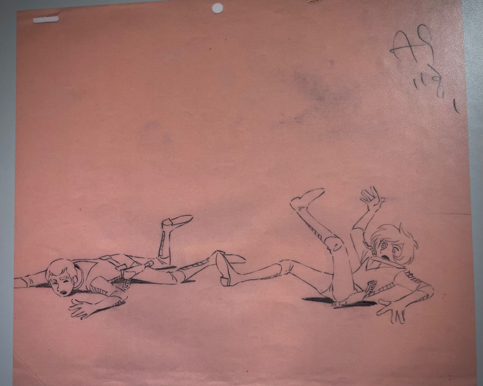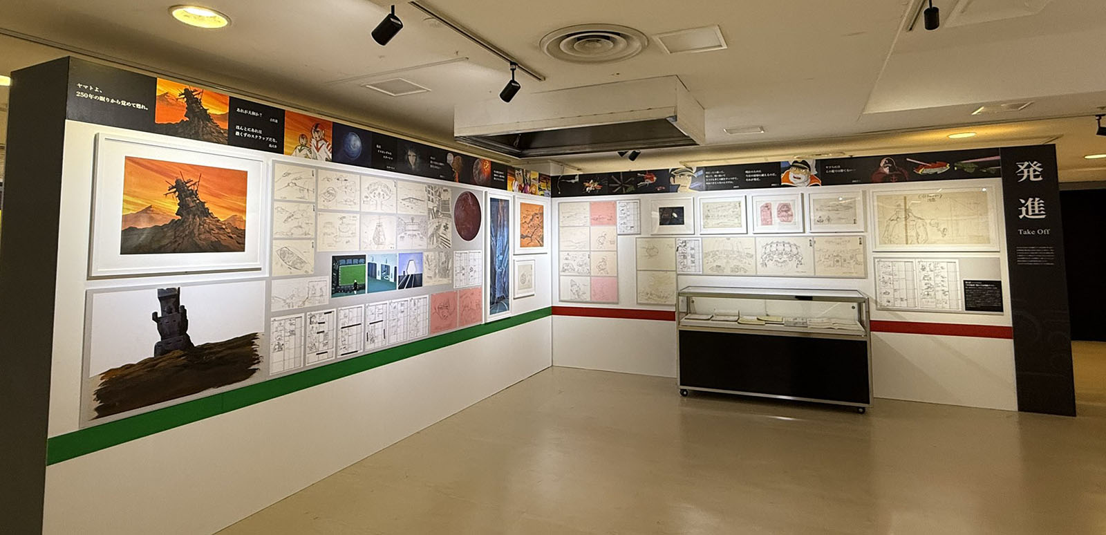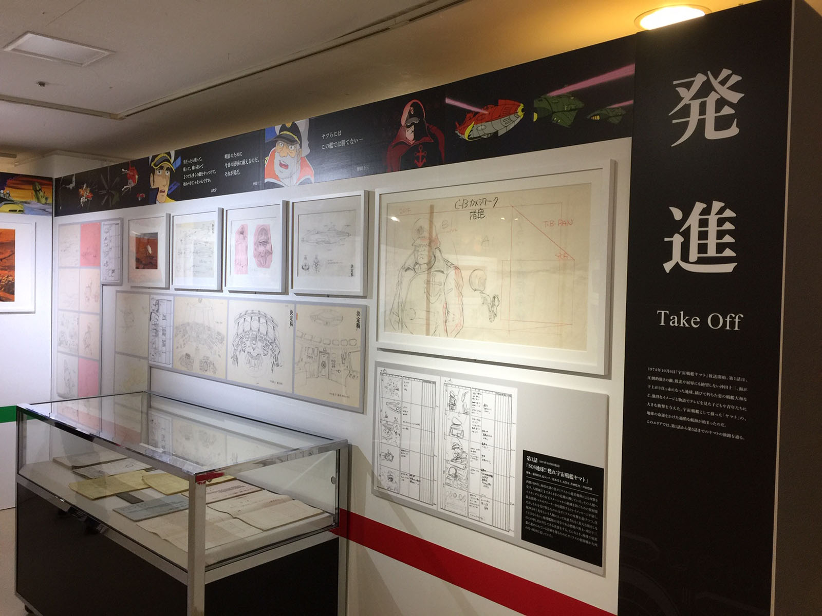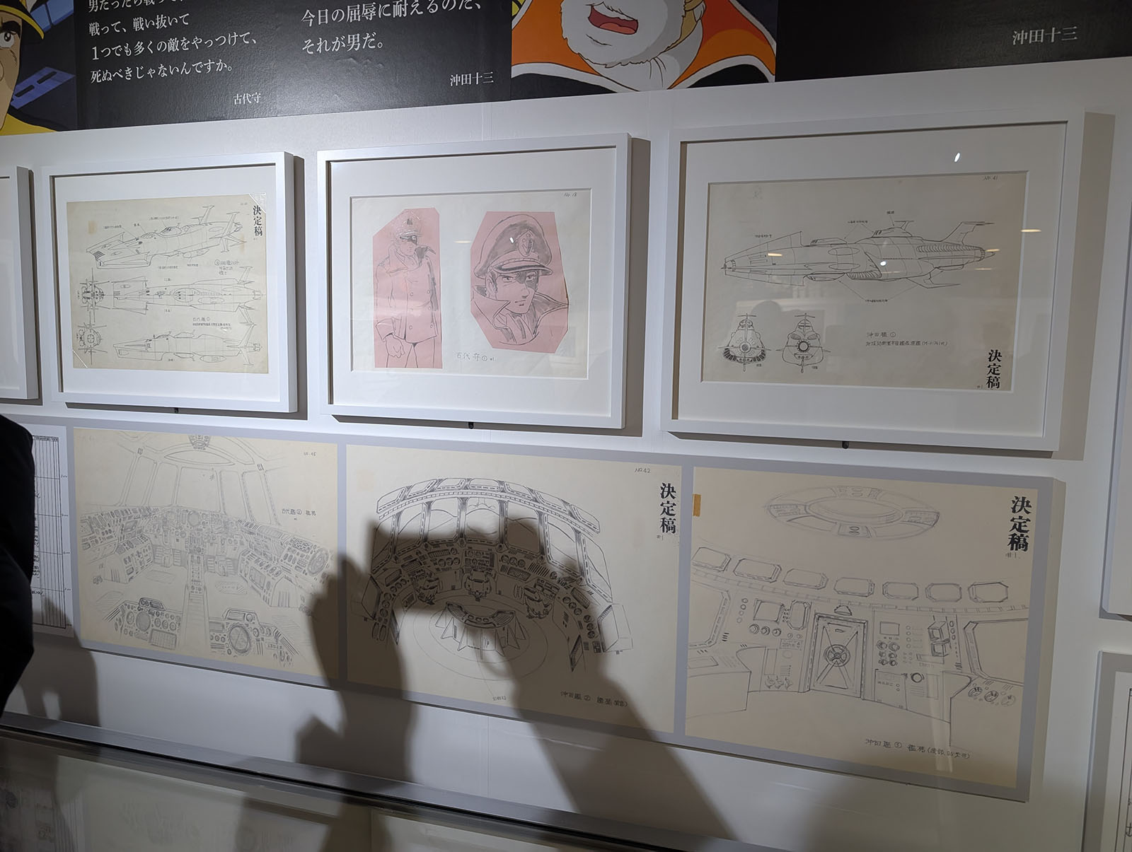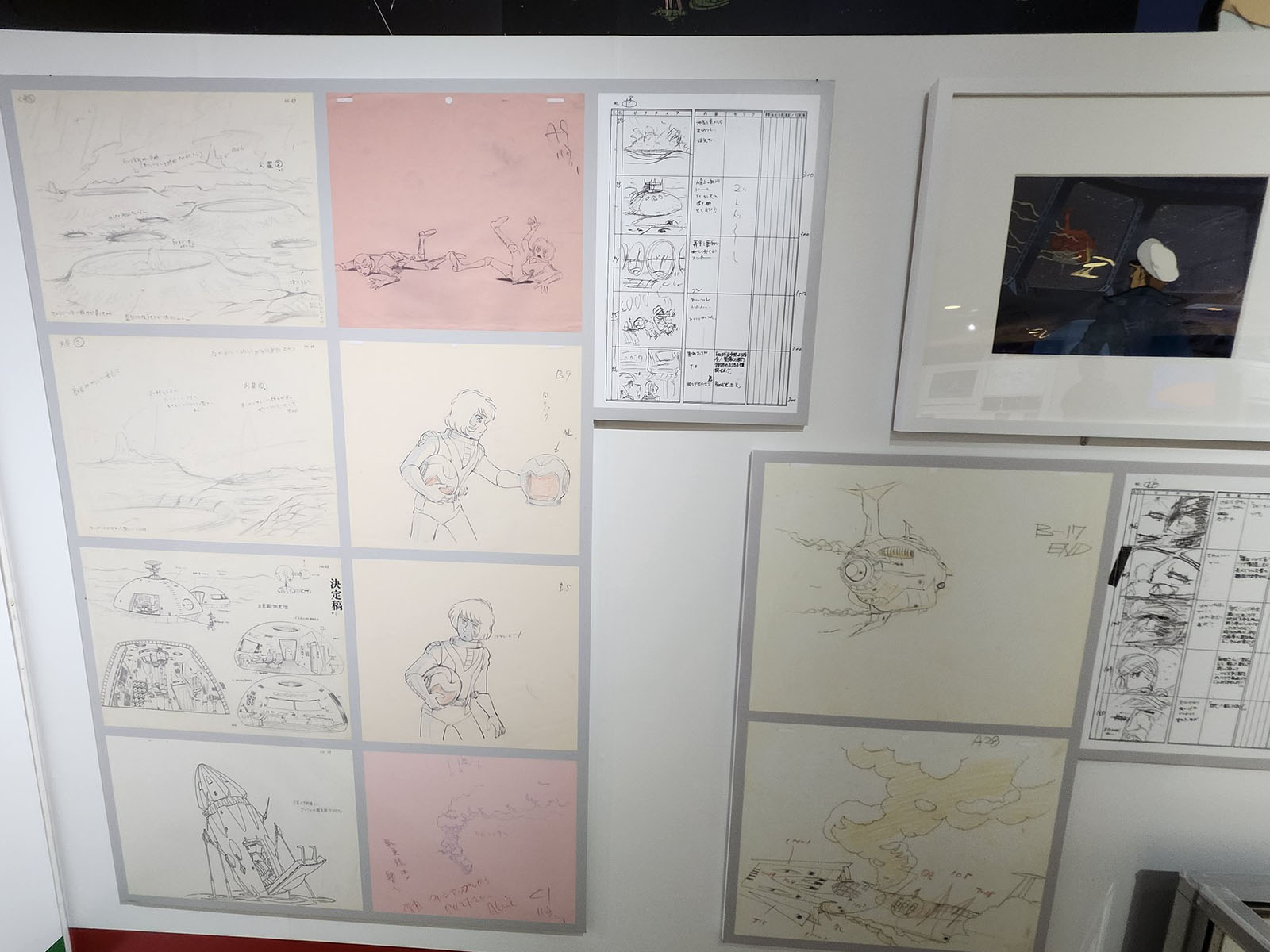 Materials for Episode 1 were spread across two walls. Every episode was represented by a mixture of storyboards, genga (animation drawings), background paintings, and cels. When original art was available, it was displayed in a frame. Stills and memorable lines of dialogue ran across the top of each wall, along with the day-by-day countdown to extinction.