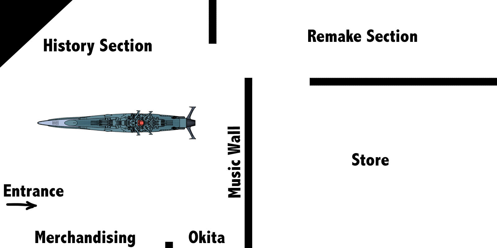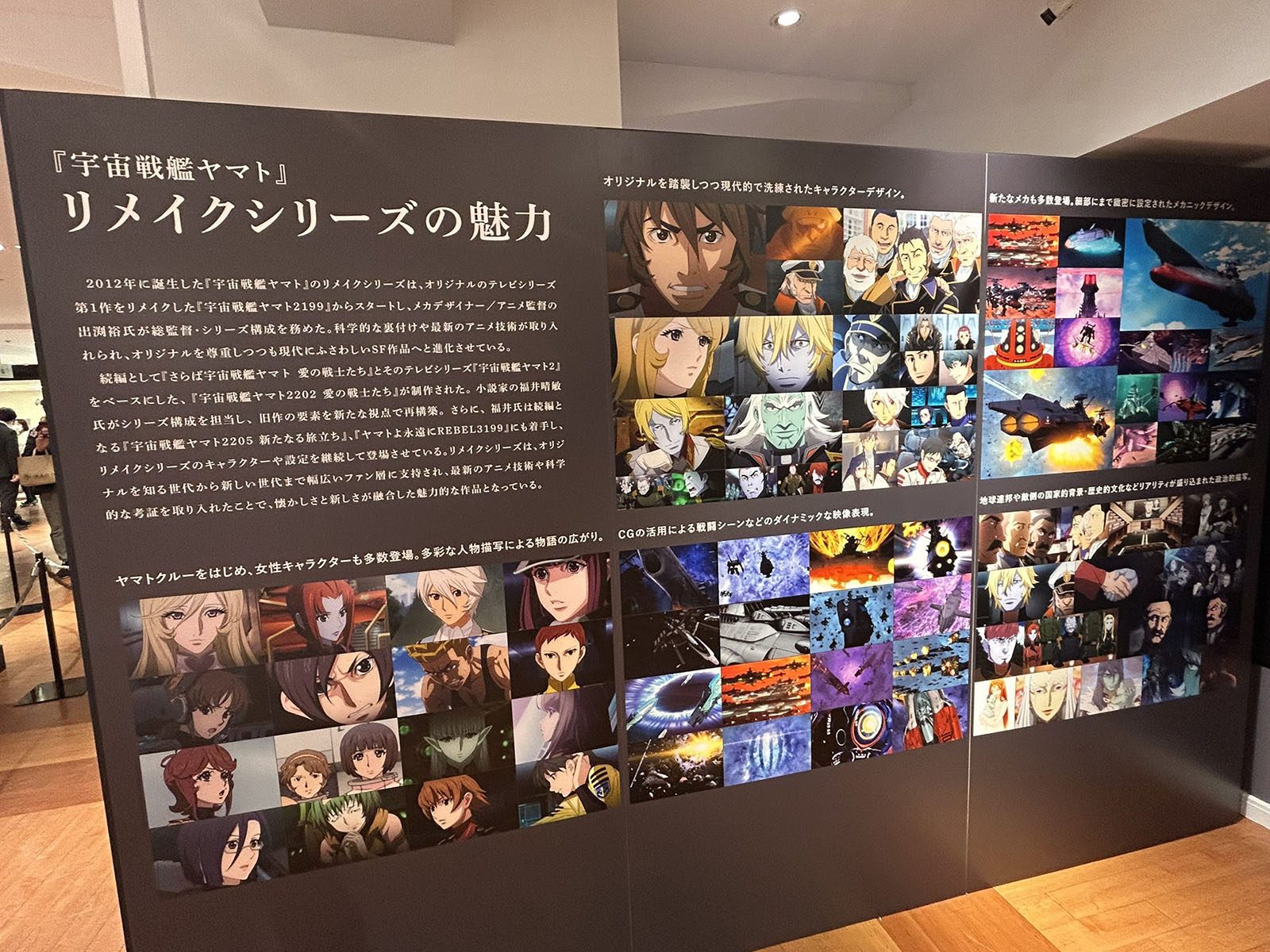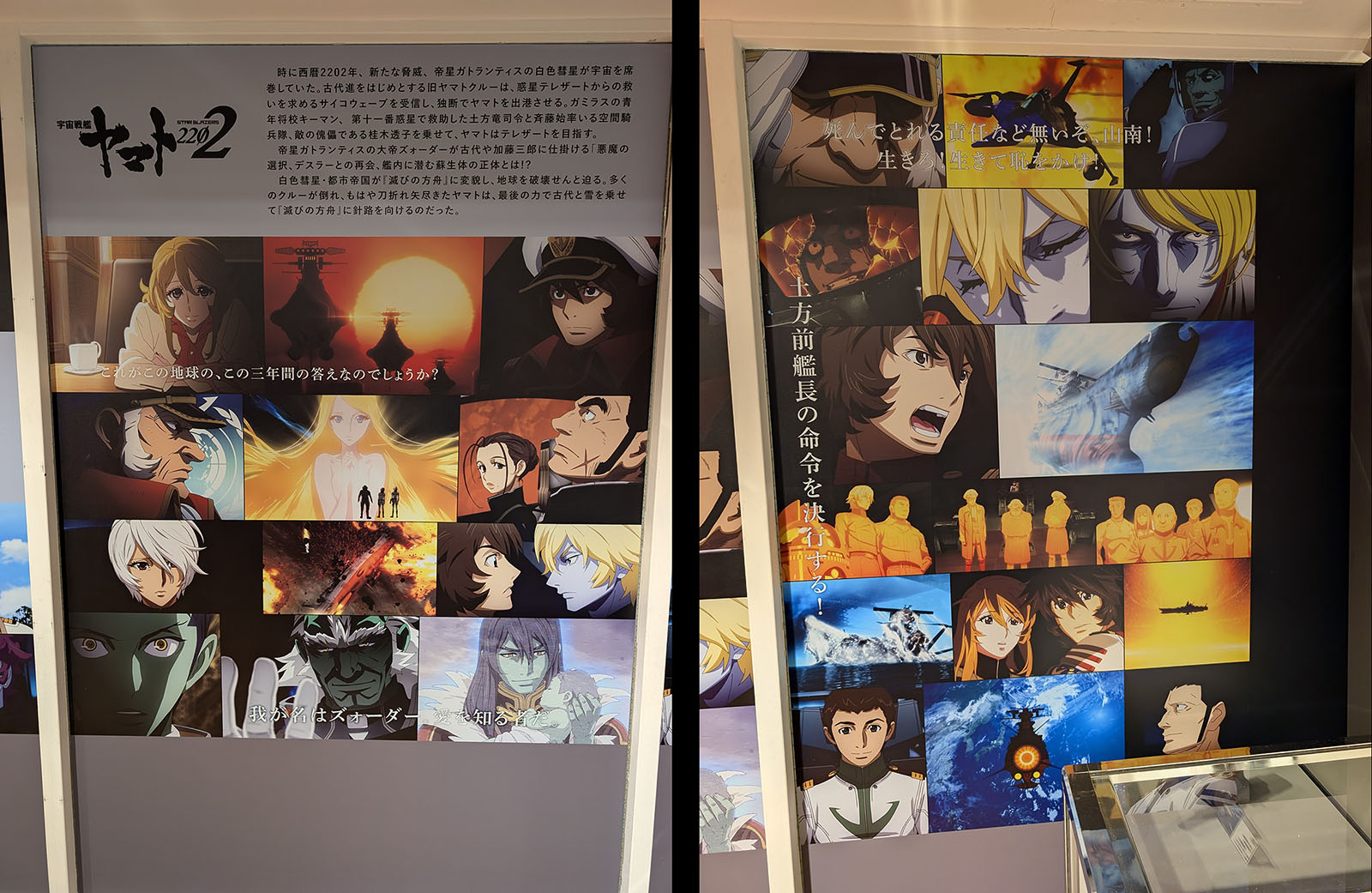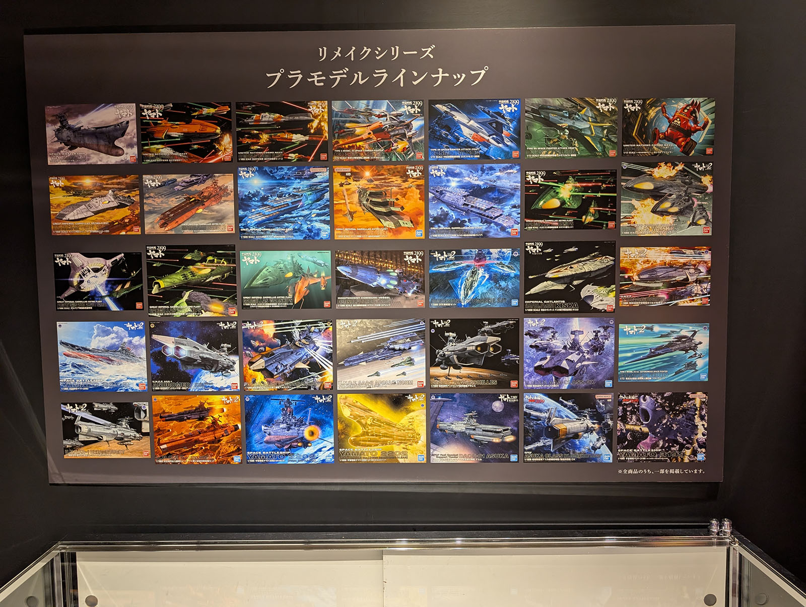 The “chronology” wall led into this area where each part of the remake series got its own panel. The display case at the end contained model kits. The exhibition store was on the other side of the wall at right.