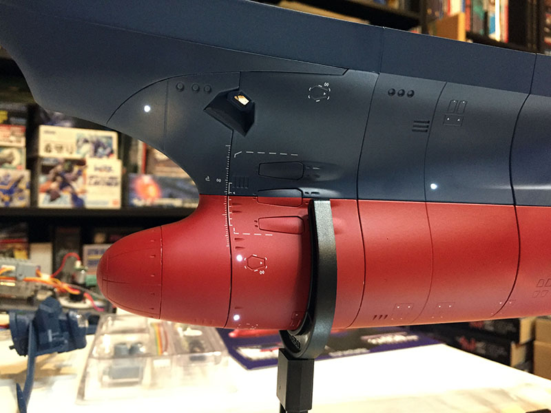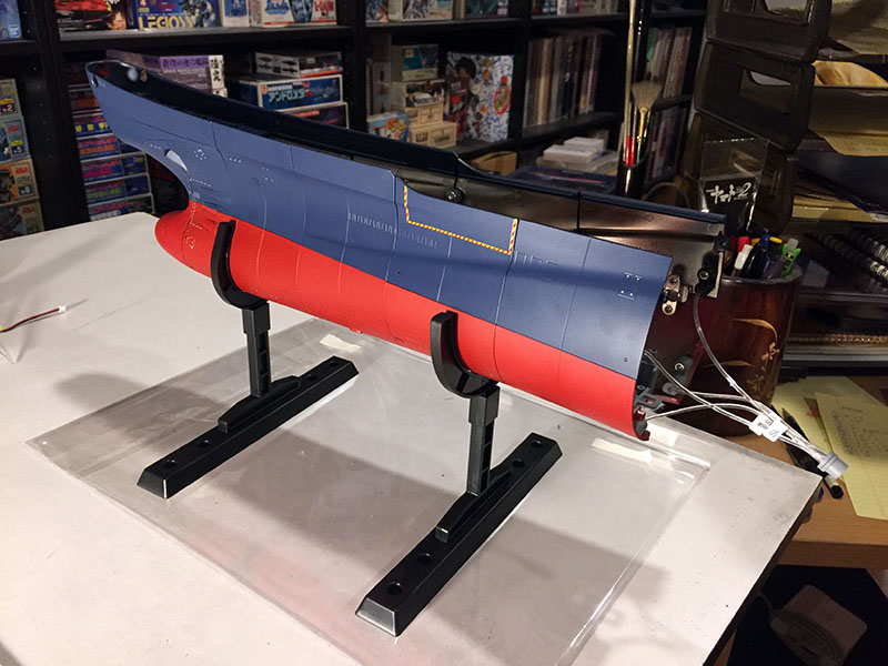 Here’s what the ship looks like underneath. That’s quite a mismatch running down the central axis, but there’s nothing to be done about it. When I first learned how large this model was going to be, I thought the only sensible way to construct it would be just like a real ship; lay down a keel and build the hull around it. They’re not going that way here, and I think this is the result. A keel structure might have gotten in the way of the internal electronics, I don’t know.