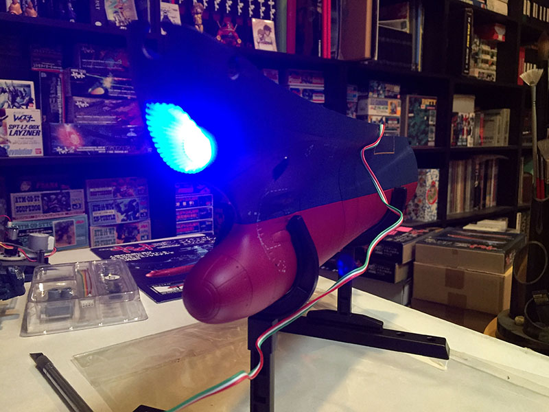 JEEBUS CRIPES, THAT’S BRIGHT! There’s also a sequence programmed into it. The light amps up, starts flashing, and then goes solid. This will sync up with a WMG sound effect that is programmed into the permanent base stand coming at the end. In the meantime, you could easily read by this light.