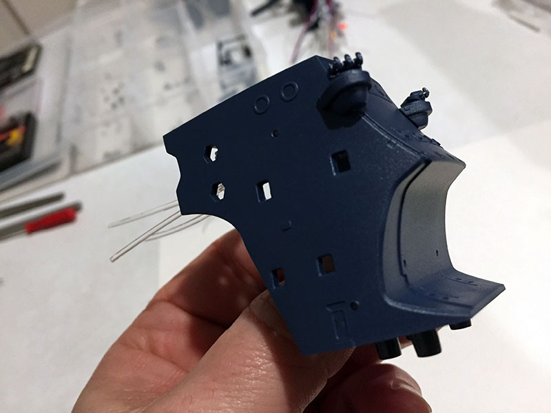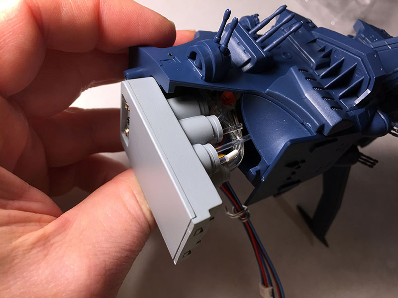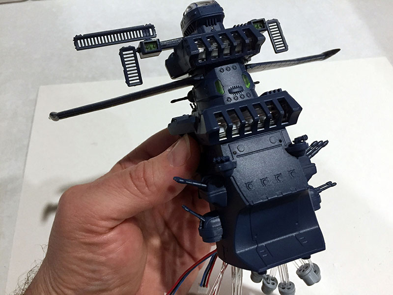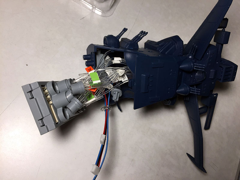 Here’s the back end. That’s a LOT of spaghetti. Each individual fiber leads to a light. The wires lead to LEDs inside the dome and both bridges. Take note of how far down they protrude and how stiff they are. That’s important.