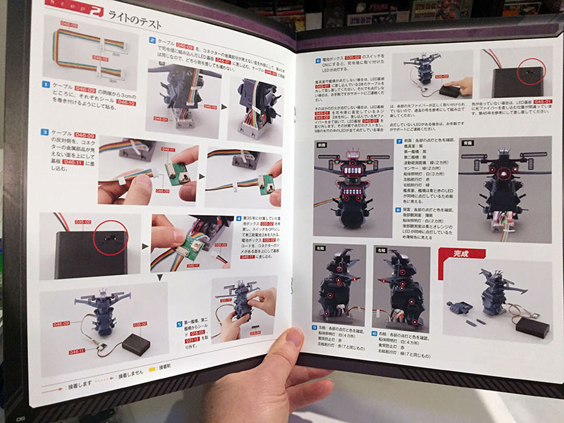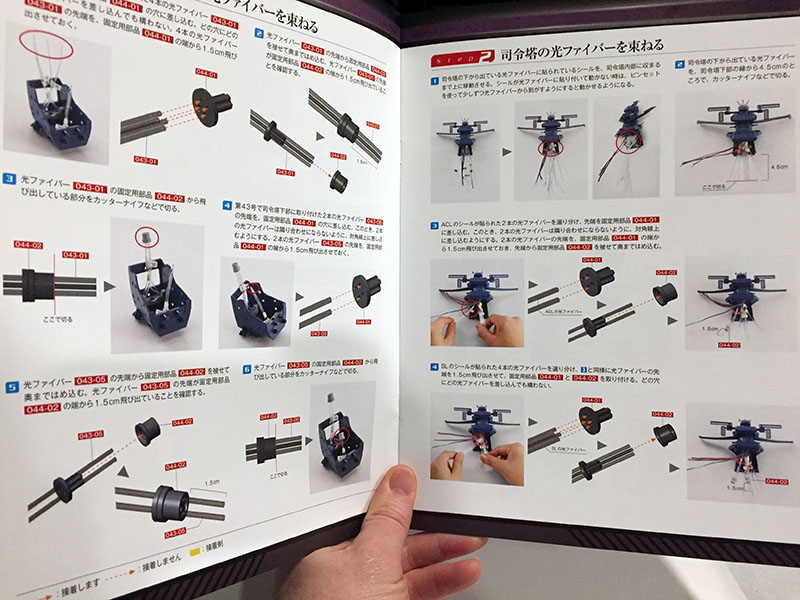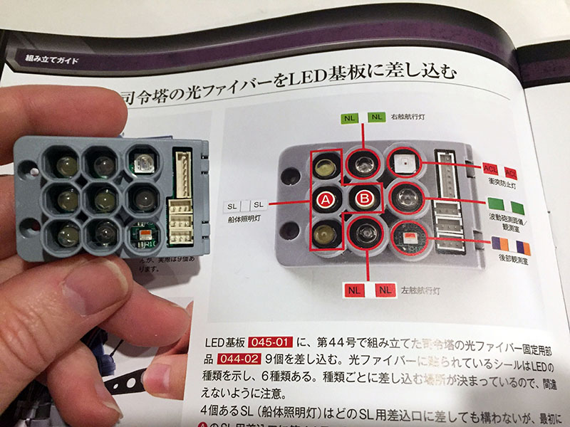 Each of those nine ports contains an LED bulb or circuit. The plugs on the right side are for the wires. The lights in the dome and bridges will change color, so they are a little more complex. I translated the text to figure out what the A and B ports are all about. Certain fibers should go there to make installation easier. All right, let’s get started.