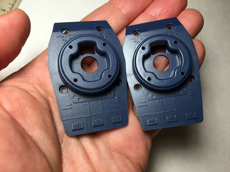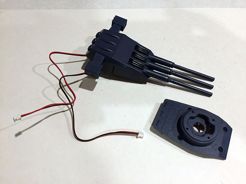 And there’s the finished turret with the replacement installed. The “defective” part is off to the side. Now, remember what I said earlier about a problem with the cannon barrels? They all connect to each other with a metal rod. It’s a hinge that fits loosely into a hole that runs through all three of them. Two of them worked fine, but the third was far too tight. I had to get out a drill and bore a wider hole through a VERY small part so they’d all work properly. If I didn’t do that, one barrel would always be stuck in place. It was sorta nerve wracking, but it went as smoothly as could be. Whew.