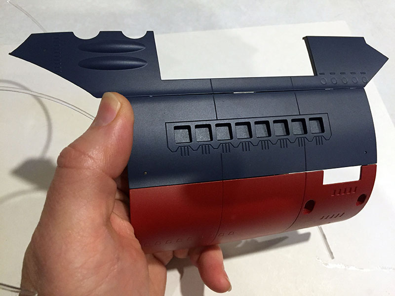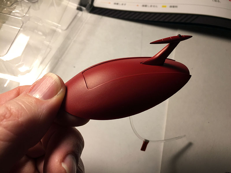 Done with the belly bubble. There’s a light at the tip of the fin. This part of the ship was used for the first time in Ark of the Stars as the launch port for the Ki-8 space boat. We saw it again as the staging area for the Space Cavalry’s mobile armor in 2202. For whatever reason, it was not given any functionality in this model. Maybe it was just one thing too many.