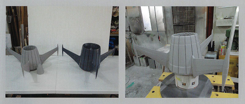 The photo at left compares the main nozzle of the 2205 version (left) and the 2202 version (right). There is no change in length, but the nozzle’s diameter is reduced to about 70%, so the vertical and horizontal stabilizers were newly built so the wing tips would be match the horizon of the hull. In addition, the cone inside the nozzle is a separate part because of the electronics that reproduce the propulsion energy light from the Wave Engine.