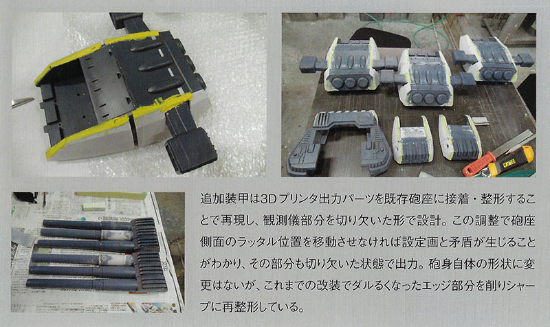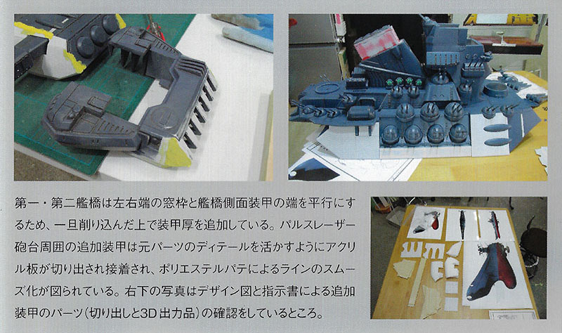 The first and second bridges were modified to make the window frames at the left and right ends parallel with the edge of the bridge side armor. After this was scraped away, thicker armor was added. The additional armor around the pulse laser turrets was made of acrylic plates, cut out and glued to preserve the detail of the original parts. Polyester putty was used to smooth the lines. The lower right photo shows additional armor parts based on the design drawings and instructions (cut out and 3D printed).