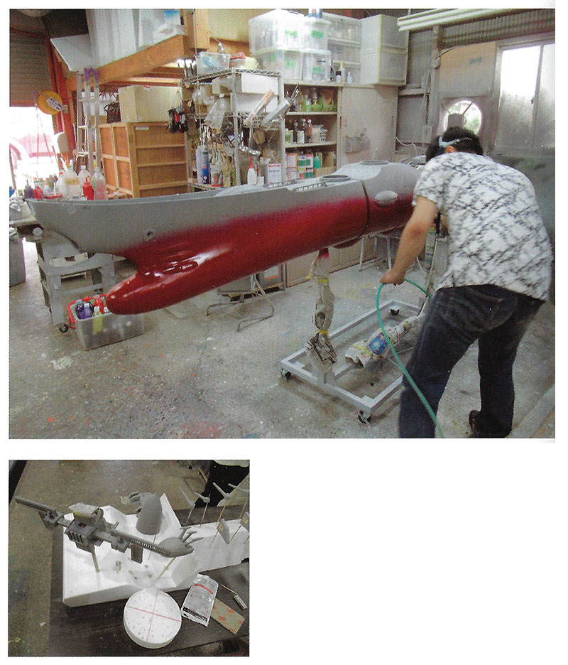 Gonjou: It’s about the same as painting a car, but as I mentioned earlier there are many “model” parts, so you can’t just apply a thick coating. Basically, we use an airbrush gun about ten times larger than average. For the delicate parts, you can think of the work as being similar to that of a plastic model. The process of smudging and staining is basically the same. The work is very time-consuming and labor intensive, but it is a 3-meter class exhibit. We enjoyed and struggled with it.