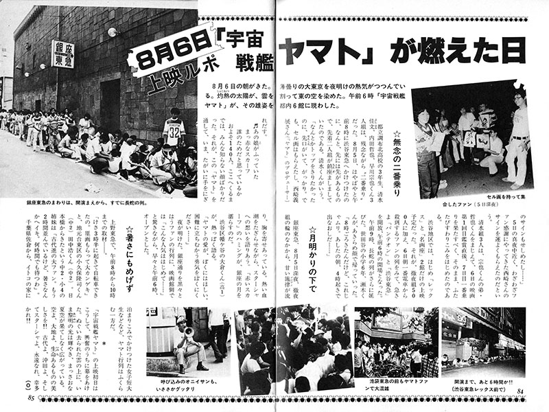 The morning of August 6 arrived. The heat of dawn enveloped a lightly overcast Tokyo. The scorching sun broke through the clouds and colored the eastern sky. At 6:00 a.m., Space Battleship Yamato made its grand entrance into six Tokyo theaters.
