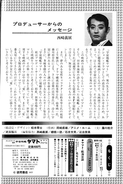 As a producer, I would like to make films for the global market in the future. I believe that Space Battleship Yamato is the first step toward that goal. The theme of a world-class film is, after all, “love,” the common theme for all mankind. Since this is what I cherish the most, I would like to continue to depict “love” as a theme for boys and girls who are about to start their lives.