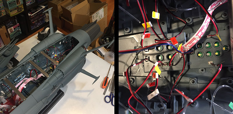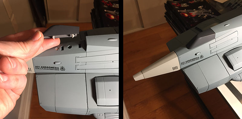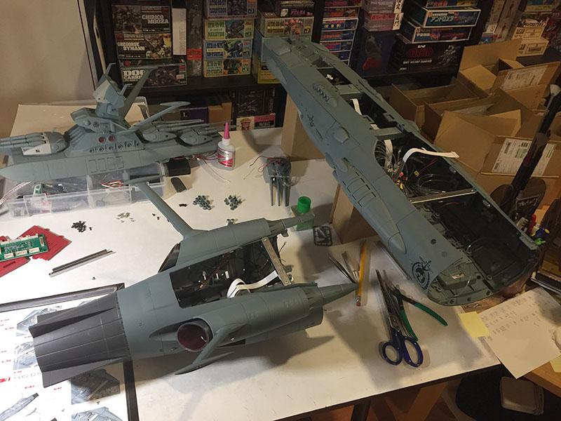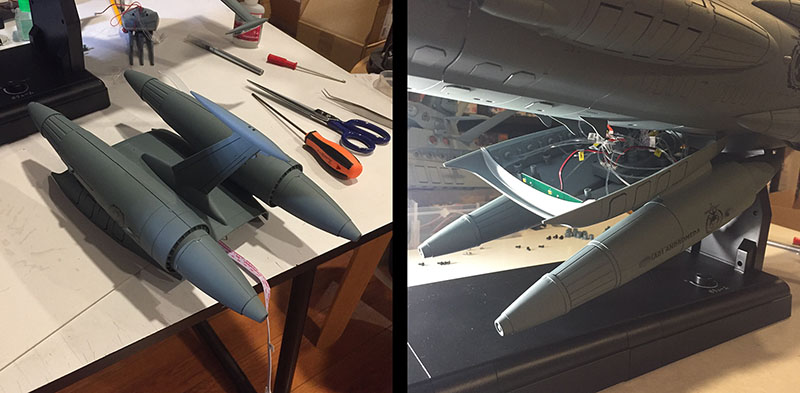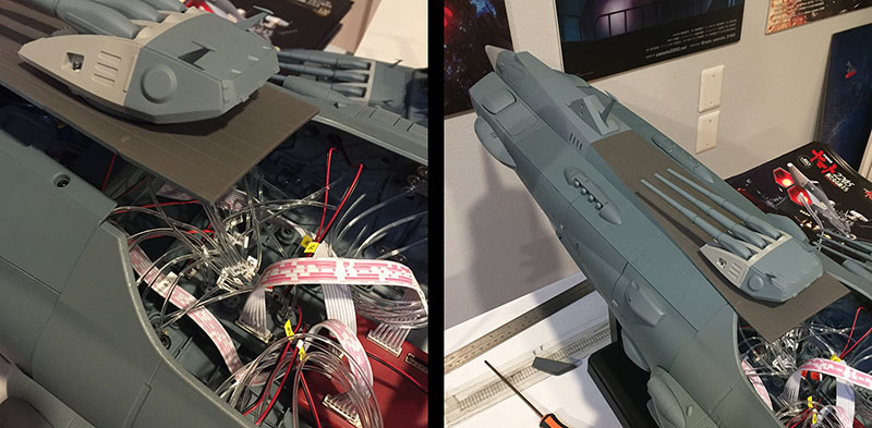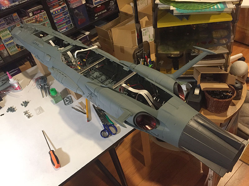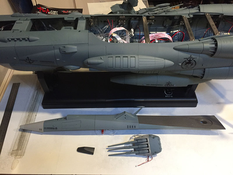 I opened the hull back up to make sure all the wires were in their plugs. And they are. I followed the instructions to the letter. There isn’t a thing wrong with the construction. And there are only a few reasons this could be happening. The most likely is that there’s a fault in the power supply from the stand, and none is being delivered to the ship. But I have no way to test whether or not that’s true. It’s just the best explanation.