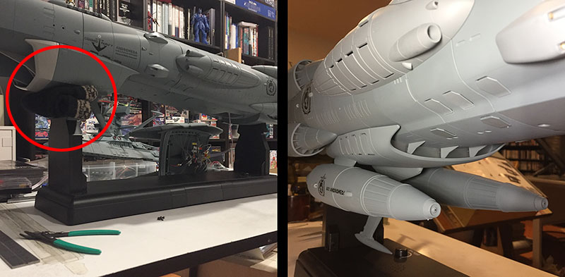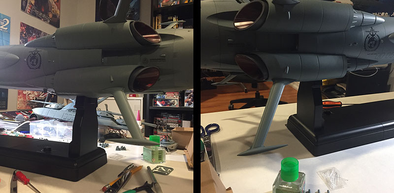 Now the next BIG MOVE: install the undercarriage. First, I suck it up and superglue the fin onto the bottom. Naturally, there’s spooge because the undercarriage is as cursed as Yamato‘s third bridge. But then I cap the superglue for good. It will not be needed again.