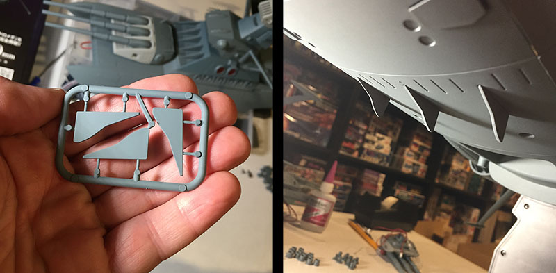 Now there are these little fins to deal with. They attach to the underside of the hull, to become part of the undercarriage. The instructions say to just insert them into their tiny holes, but they fall right out so I have to glue them. Fortunately, the belly is all plastic so I can just paint the tips with standard cement from the inside and they stay put.