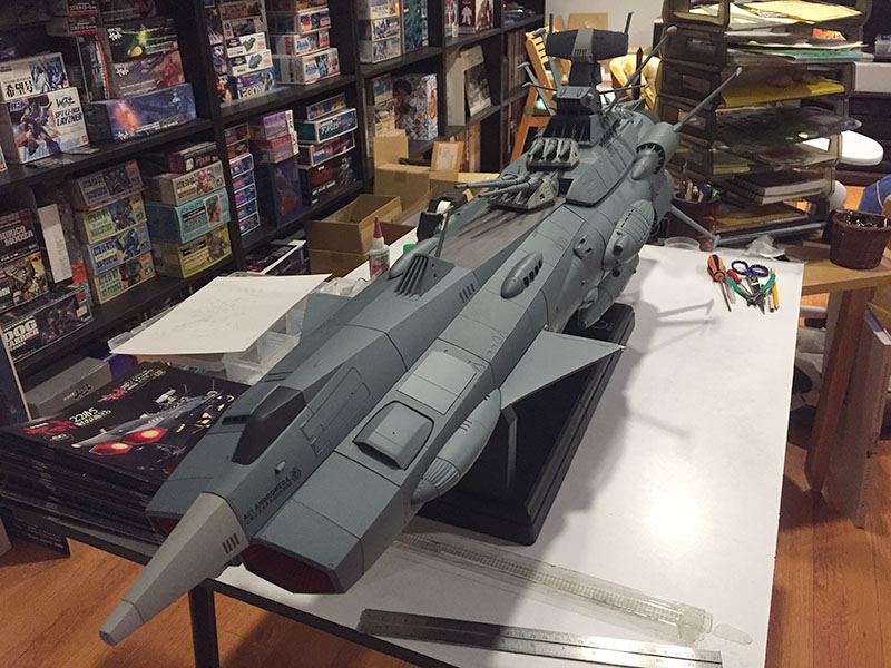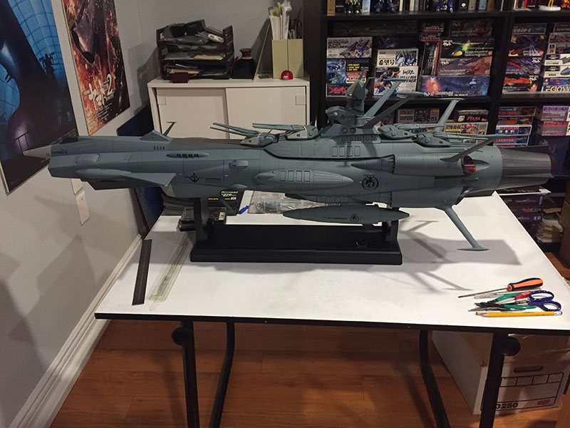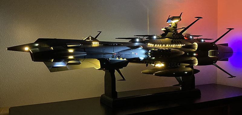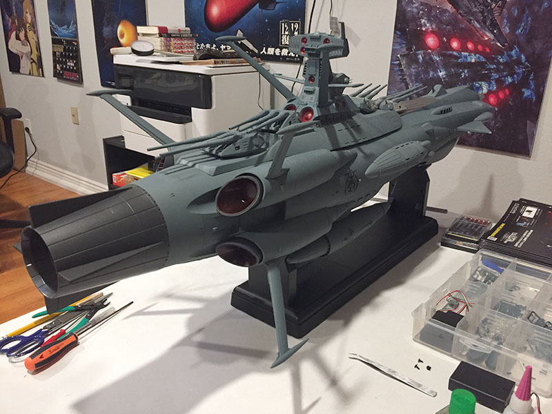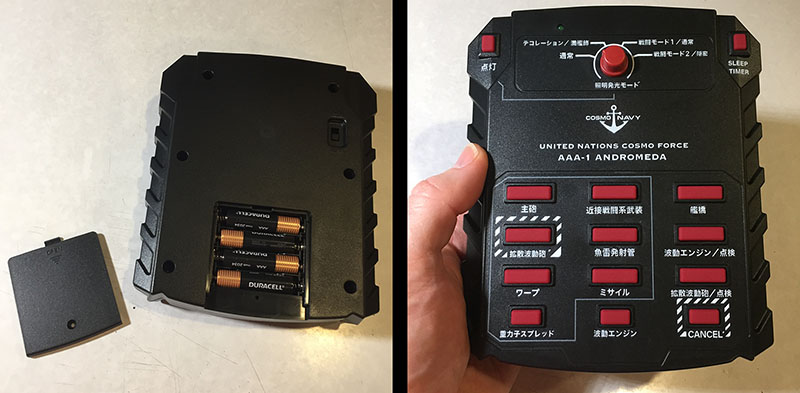Screw the two halves together, install batteries, and done. There are quite a few functions on this thing. Four different light modes (at the top) and a bunch of sound effects linked with different lights (at the bottom). Engines, warp, Wave-Motion Guns, main batteries, missile launchers, etc.
