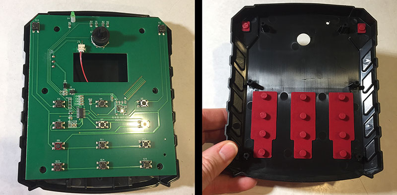 First, the circuit board drops into the back half. Then rubber button parts drop into the front half.