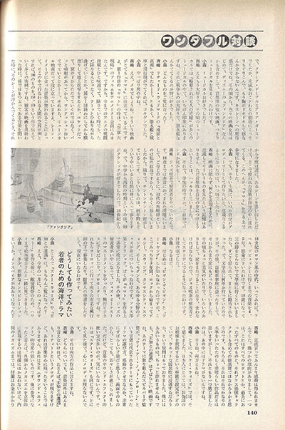 Nishizaki: No. At that time, I was only interested in movies. When I entered junior high school and went to Musashi High School, I had to go to Ikebukuro [entertainment district in Tokyo]. I saw a lot of colorful movies there. There was a movie called Adventure, when kiss scenes were still rare in Japan. It featured Clark Gable and Greer Gershon, right? I snuck into a theater where minors were not allowed. My heart was pounding so hard in anticipation of the kiss scene, I couldn’t follow the story. I started watching a lot of movies around that time, including Disney’s Fantasia. I watched films with strong musicality.