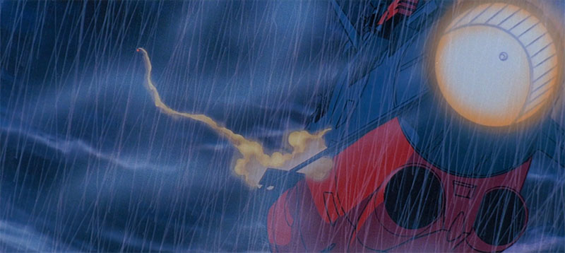 The Cosmo Hound launched from a dedicated ramp on the port side of Yamato, which hovered steadily in the torrential downpour. However, strong winds blew the Cosmo Hound to the left, causing it to lurch.
