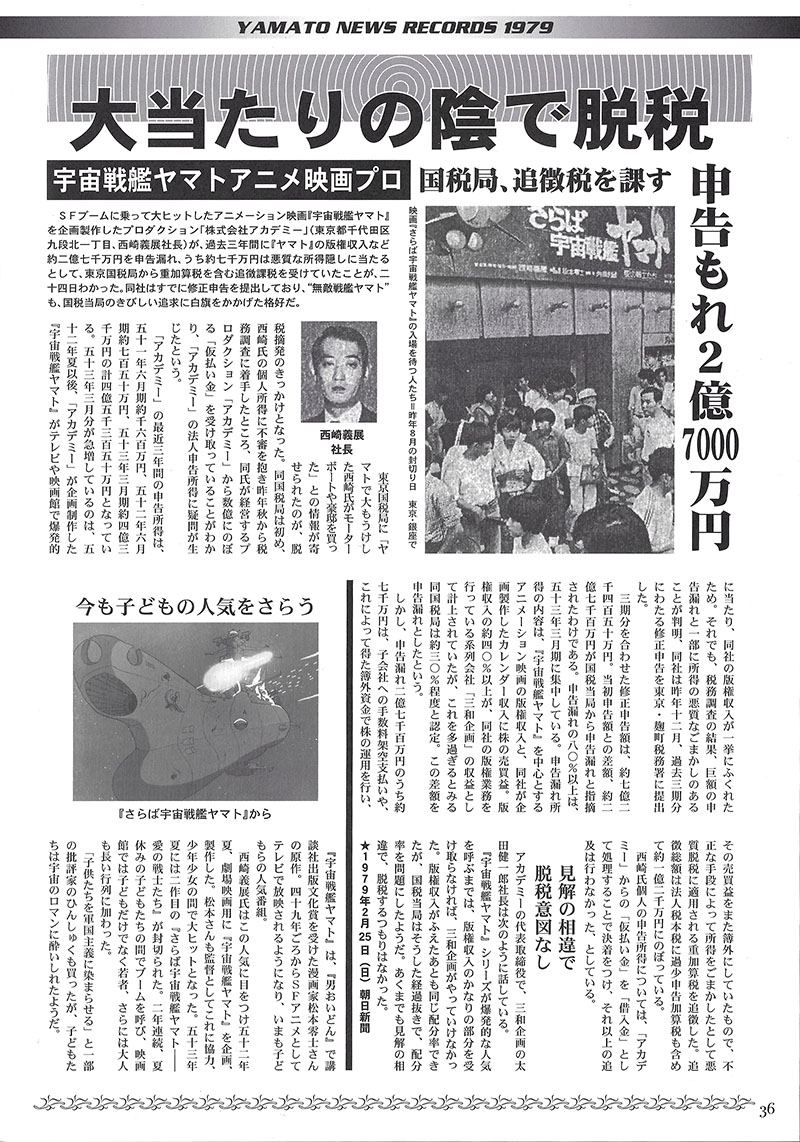 Academy Corporation Ltd., the production company that planned and produced the animated film Space Battleship Yamato, which rode the sci-fi boom to great success (President: Yoshinobu Nishizaki, Kudan-kita 1-chome, Chiyoda-ku, Tokyo) failed to declare approximately 270 million yen in copyright and other income from Yamato over the past three years.