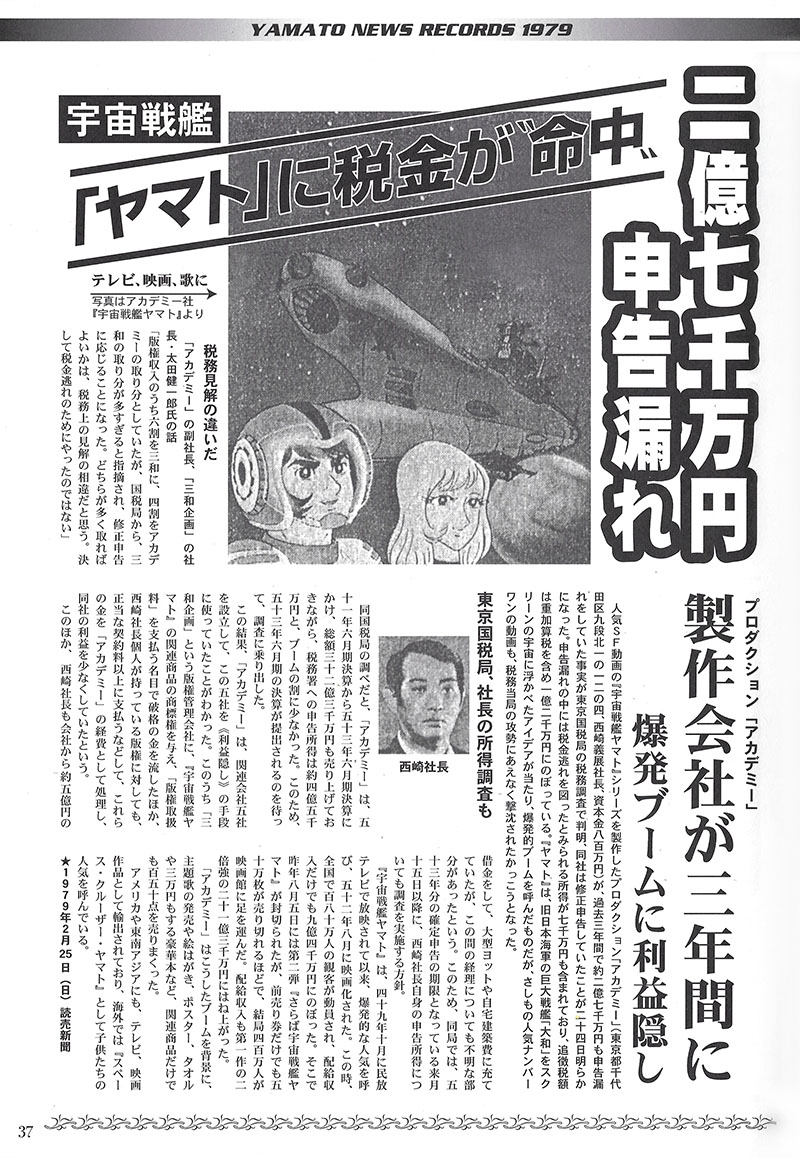 Academy, the production company that produced the popular science fiction video series Space Battleship Yamato (12-4, Kudan-kita 1-12, Chiyoda-ku, Tokyo; President: Yoshinobu Nishizaki; Capital: 8 million yen), failed to declare approximately 270 million yen over the past three years, according to a tax investigation by the Tokyo Regional Taxation Bureau.