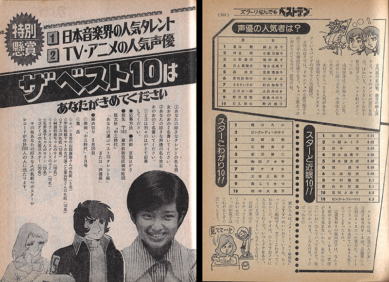 Announcement of a “Best Ten” reader poll for the May issue. One of the prizes was a card signed by the voice actors for Kodai and Yuki