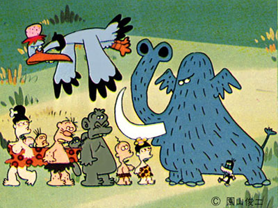 Lastly, I would like to introduce First Human Gyatoruz, an anime adaptation of Shunji Sonoyama’s gag manga. Co-produced by Asahi Broadcasting Corporation and Tokyo Movie, a total of 77 episodes aired from October 1974.