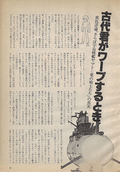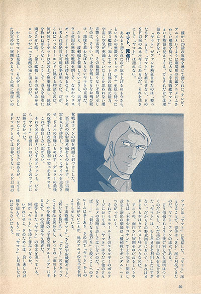 I like science fiction, but I cannot call myself a science fiction maniac [otaku]. Pre-SF fans converged on Yamato. By becoming Yamato fans, they were able to compete with “SF” fans. This was the beginning of Yamato fandom. No matter what gets pointed out [as a contradiction], they’ll find a way to explain it. Yamato is about the fun of the story rather than the use science-fiction. Therefore, due to its lack of restraint, it should be called “anime” rather than SF.