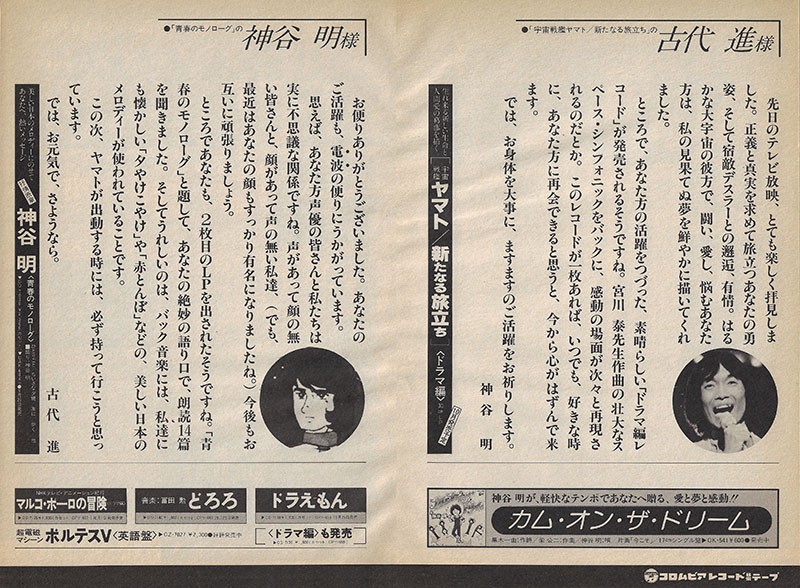 These two pages constituted a “stealth ad” by Nippon Columbia for Yamato record albums. It took the form of a message exchange between a voice actor and Susumu Kodai.