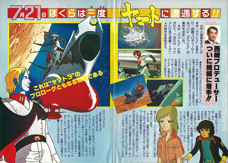 Yamato 2 ended with Kodai and Yuki Mori still alive, and Producer Nishizaki has finally decided to produce Yamato 3. Prior to Yamato 3, a new feature-length TV anime will be aired on Fuji TV on July 21.