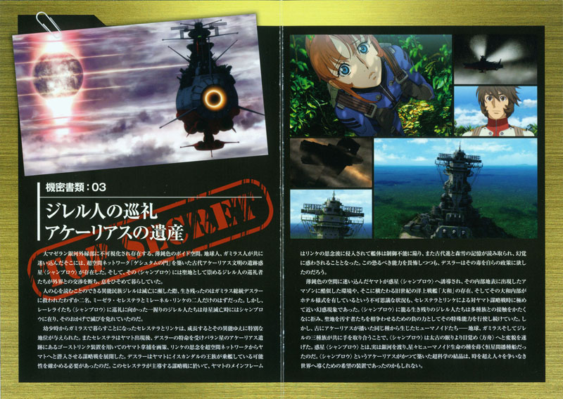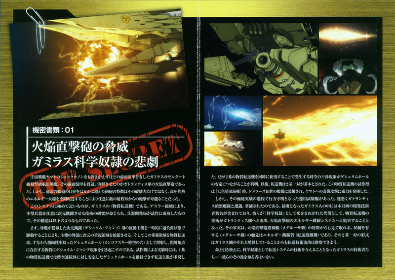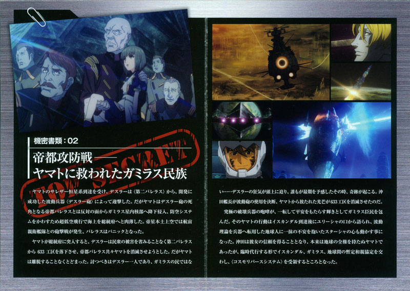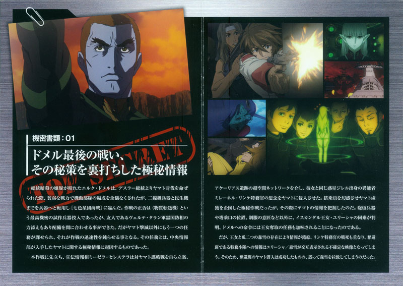 Cleared of charges in the attempted presidential assassination, Eruk Domel was ordered by Dessler to subdue Yamato. Although he was forced to organize meager military units into his task force, he converted a second-class armament and a civilian aircraft into weapons for the Battle of the Rainbow Star Cluster. The success or failure of the strategy relied on a top secret prototype weapon called the “material transfer machine” [teleporter]. With the help of his friend, Secretary of Defense Velte Talan, it was deployed in time. But there was another mission aside from Yamato‘s destruction that blunted the quick nature of the strategy. This originated from top secret information about Yamato that was obtained by the central information bureau.