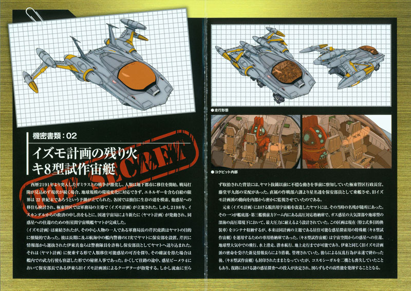 Yamato had been remodeled from what was originally an escape ship for the Izumo Plan, and remnants of that time were everywhere. One was a hangar dome beneath the ship, located ahead of the third bridge. It was designed to withstand the pressure of a gas planet’s atmosphere, or the deep sea of an Earth-type planet. This section was designated as a storage container to house “special type-2 multi-purpose retrofit vehicles,” but was exclusively used for the Ki 8-type prototype airboat, a planetary exploration vehicle from the earlier program.