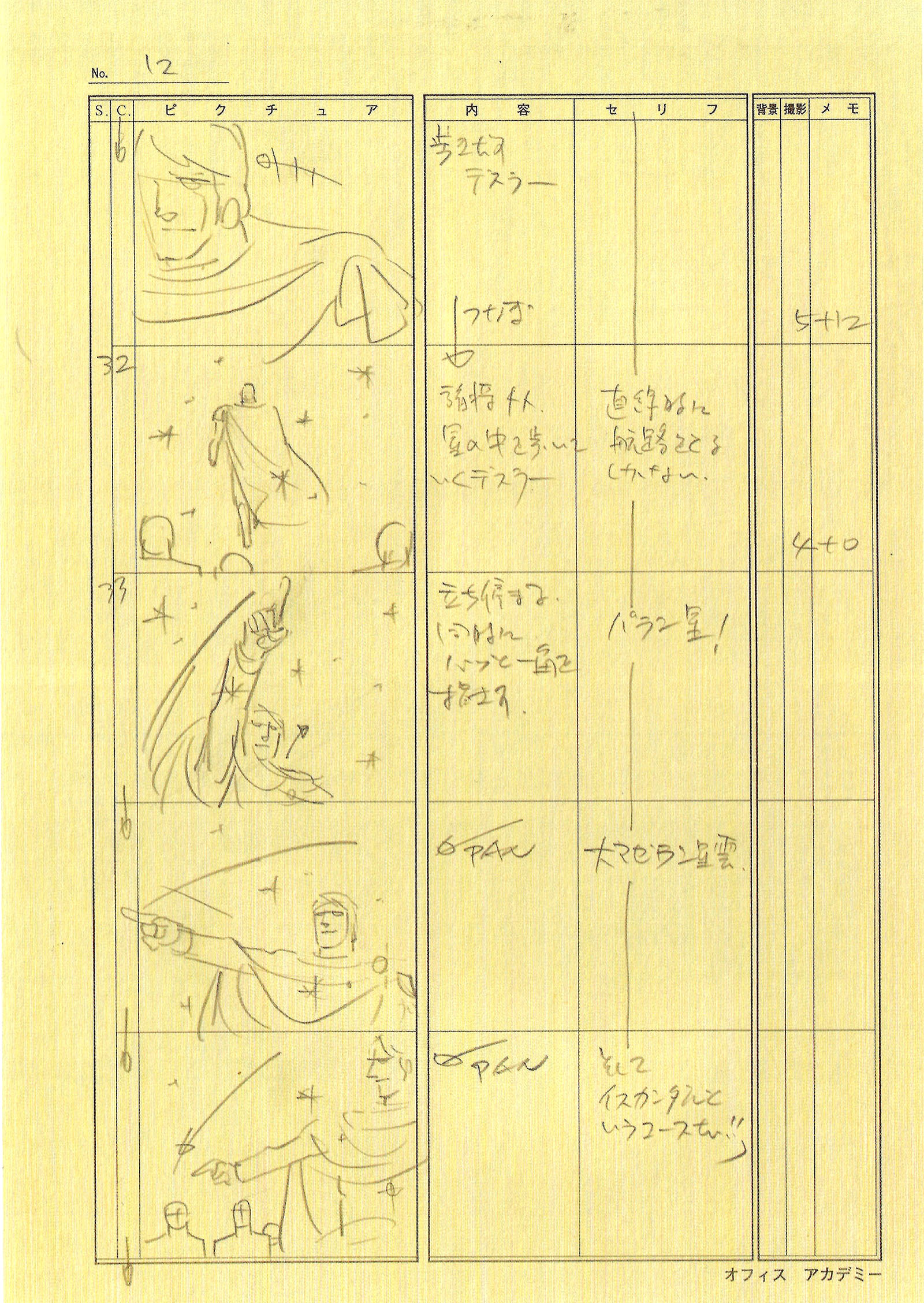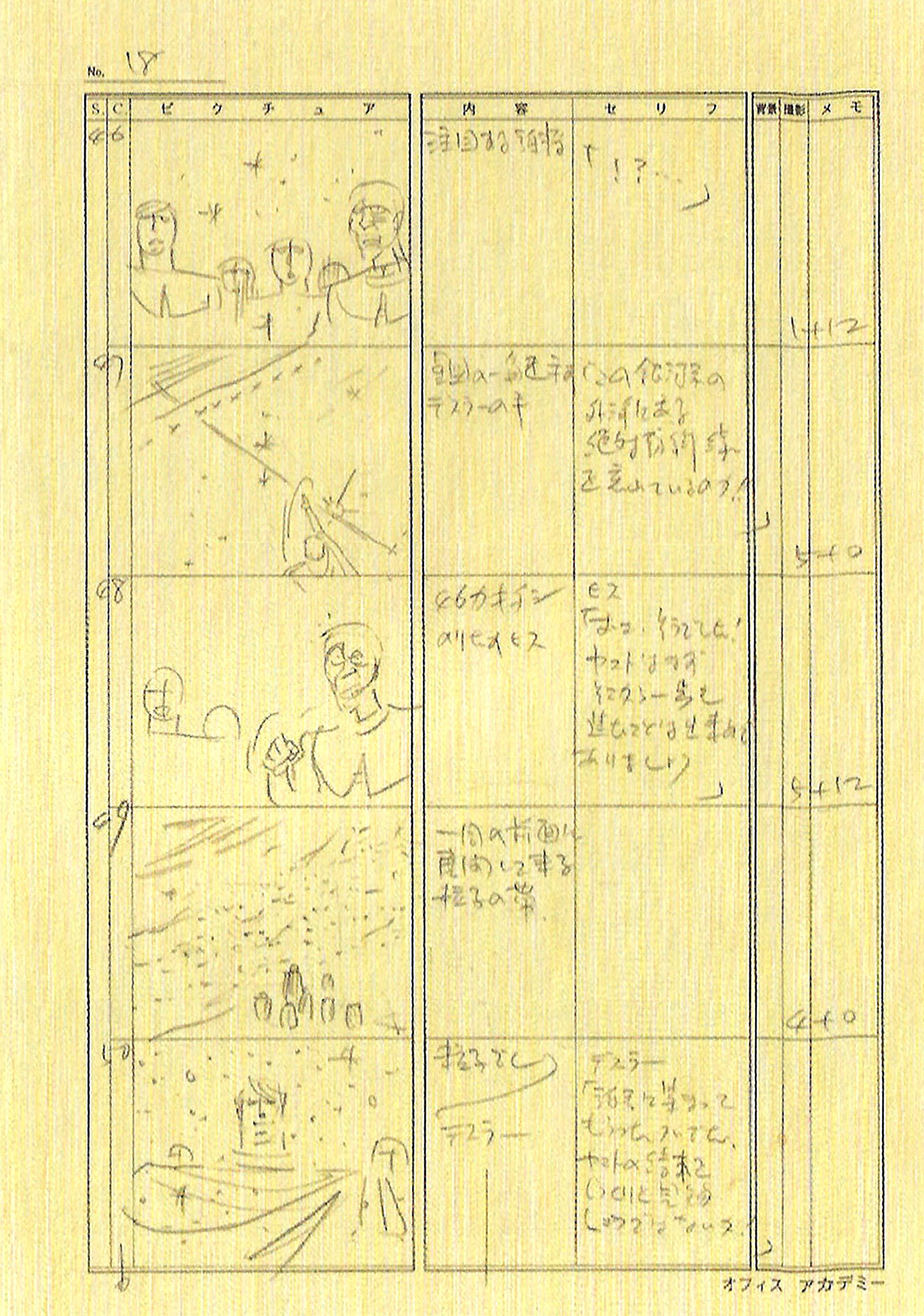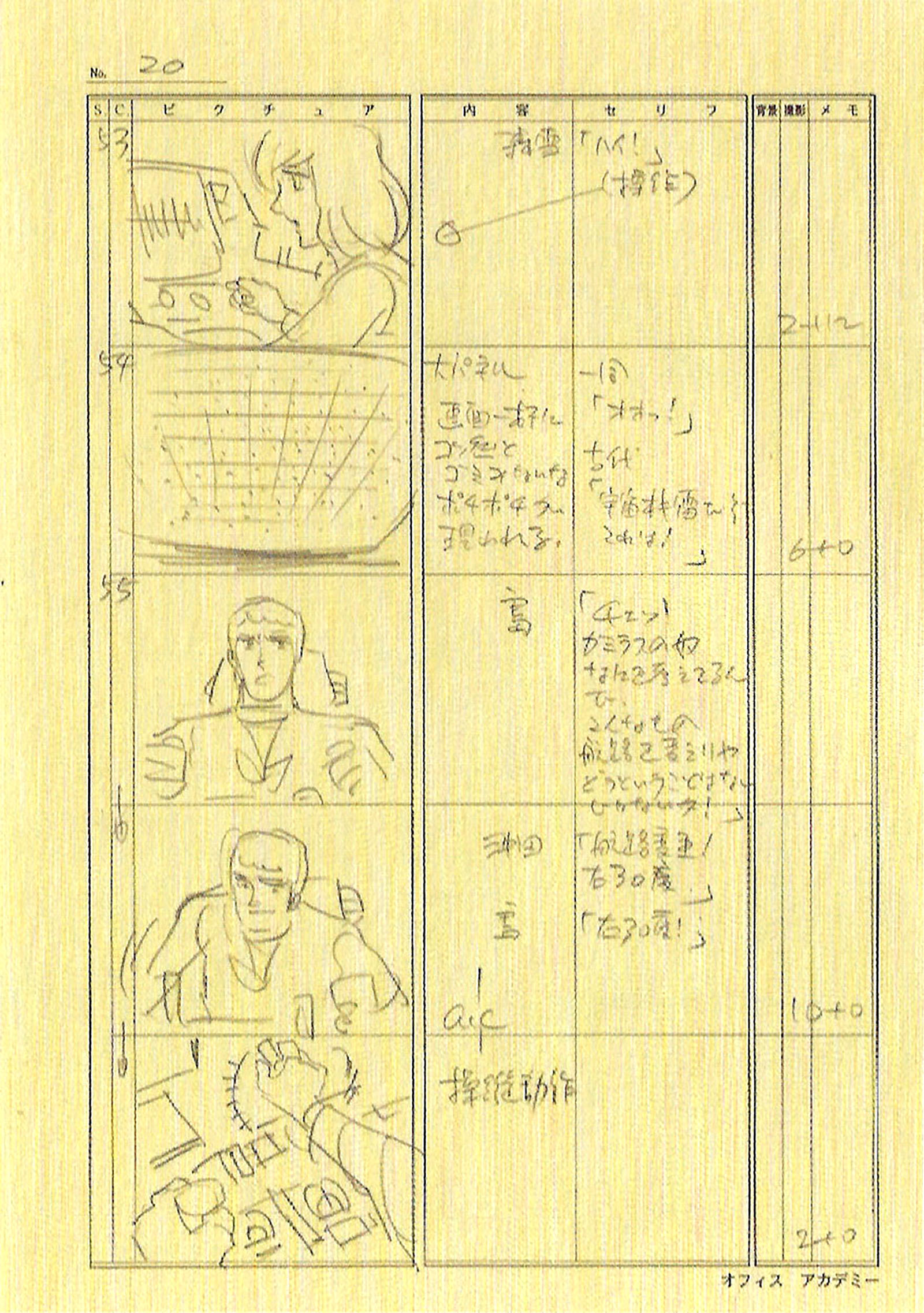 Producer Nishizaki Yoshinobu’s production style was unparalleled, and the quality and quantity of the staff surpassed the scale of normal TV anime production, but the production schedule was unpredictable due to frequent meetings. Yasuhiko participated in this work mainly as a storyboard artist. Part of the storyboard for episode 11, which Yasuhiko worked on with Noboru Ishiguro Noboru, still exists. Here we present all of Yasuhiko’s storyboards that have been confirmed.