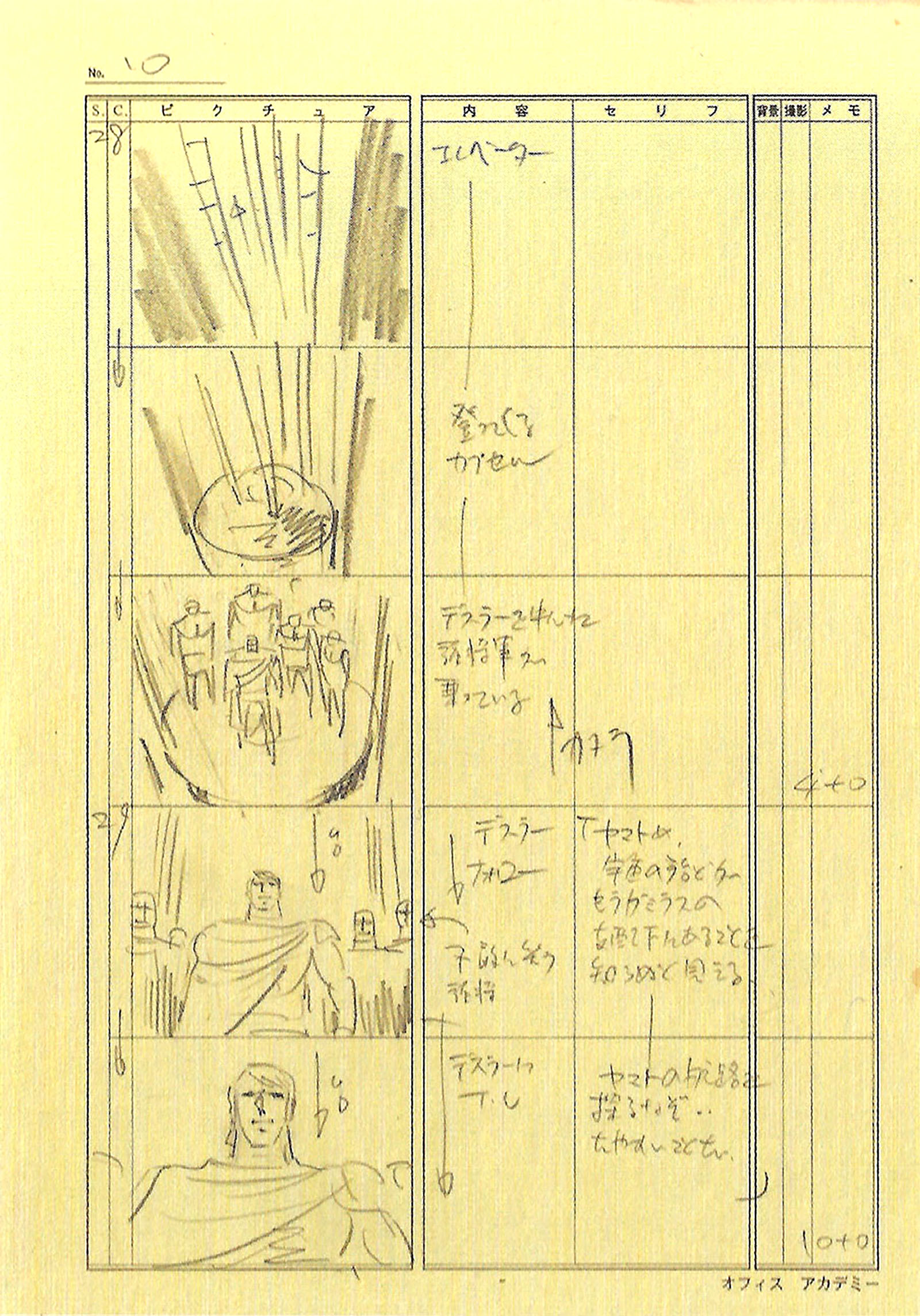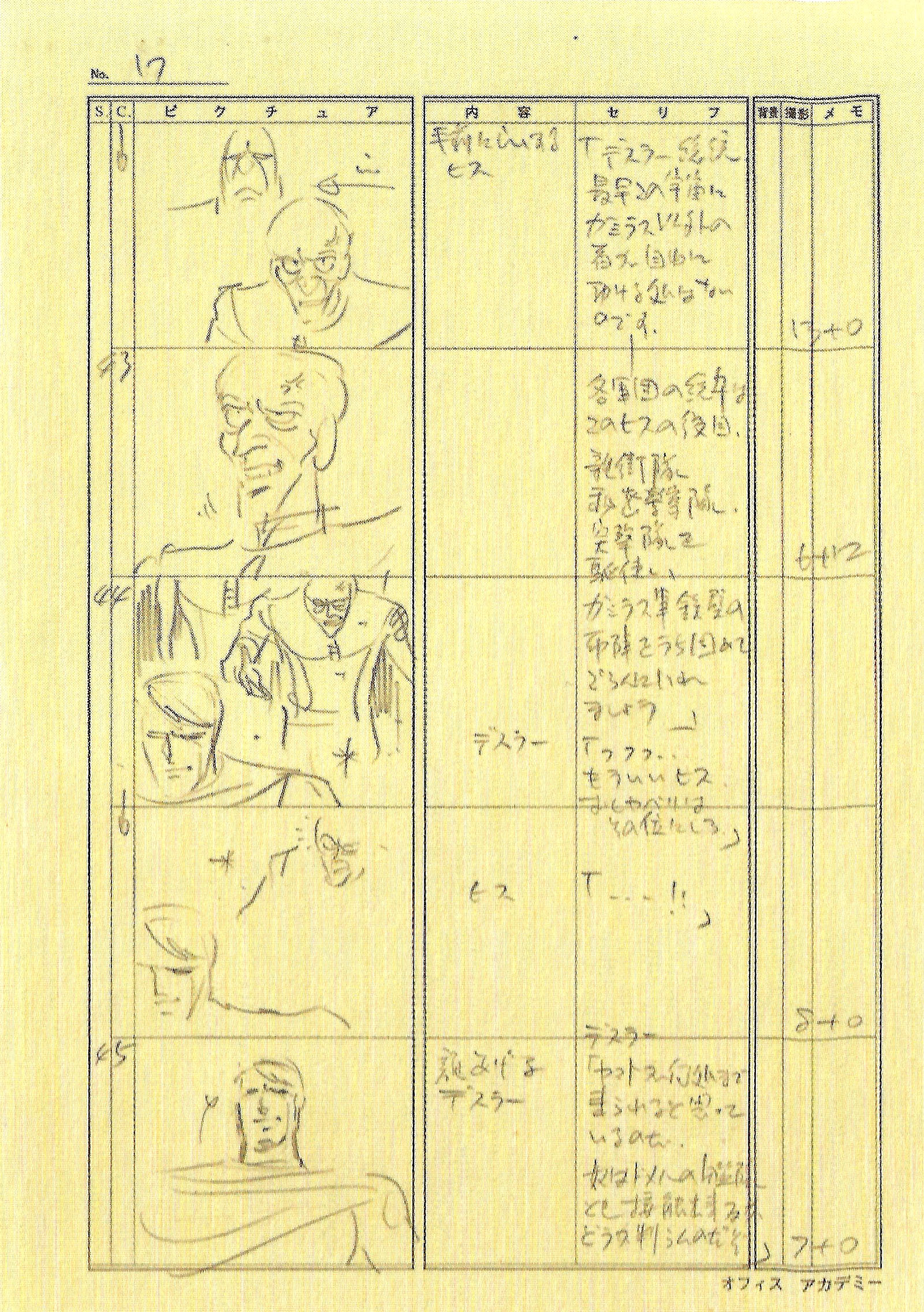 Shown here is a very rare artifact from the early history of Space Battleship Yamato, never seen before it was obtained for the exhibition. These pages contain a deleted scene from Series 1, Episode 11. That’s the one that introduced Dessler as a fully formed character. We know it as the “color shift” sequence that ends with “I can’t stand a man who laughs at his own jokes.” This sequence visualizes an early draft of the script in which Dessler leads his joint chiefs into a 3-D hologram space to map out his conquest.