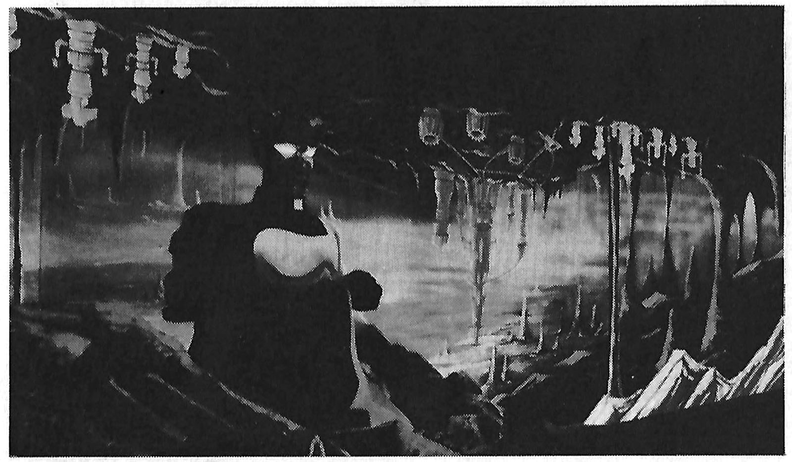 Meldars’ eyes shine sharply in the strange upside-down city and the red sea of sulfuric acid floating in the special lights.