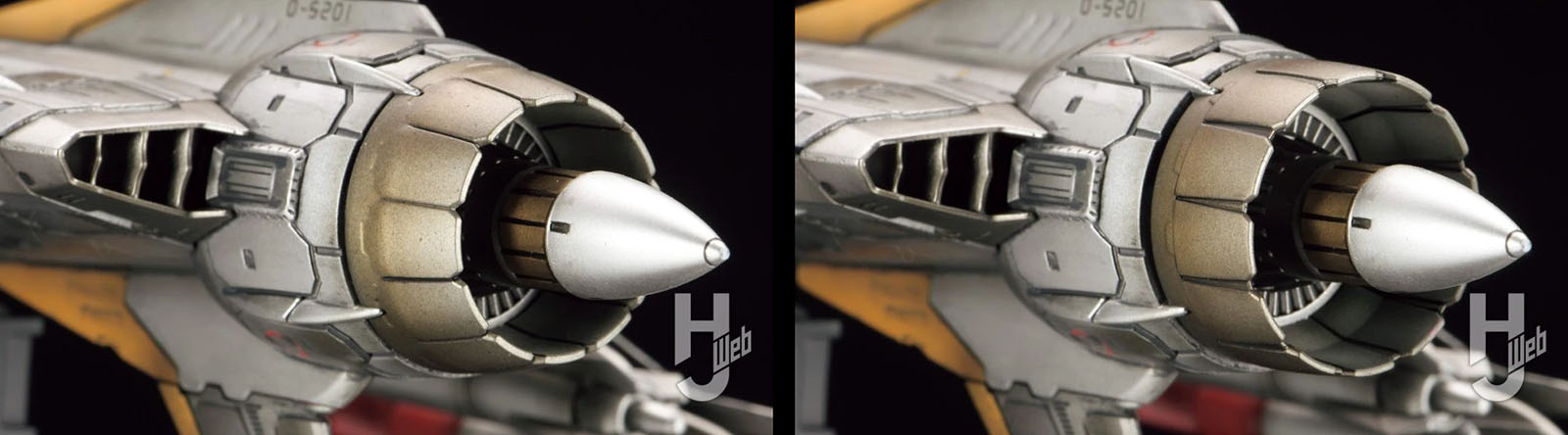 For the engine nozzles, I applied Super Titanium to the front side and Neutral White (NAZCA) to the back side as the base coat. I then sprayed Clear Blue and Clear Orange, finishing with Smoke Black.