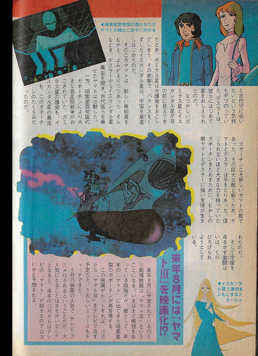 [Translator’s note: after comparing this announcement to the historical record, it appears to have either been misinformation or a plan that did not materialize. It is known that scenes were partially animated but cut from The New Voyage in its original broadcast, so the plan may have been to complete them for a rerun, but this didn’t happen. They were only seen in print media until they could be released as video bonus features in 1993.]Yamato III to be made into a movie next August?