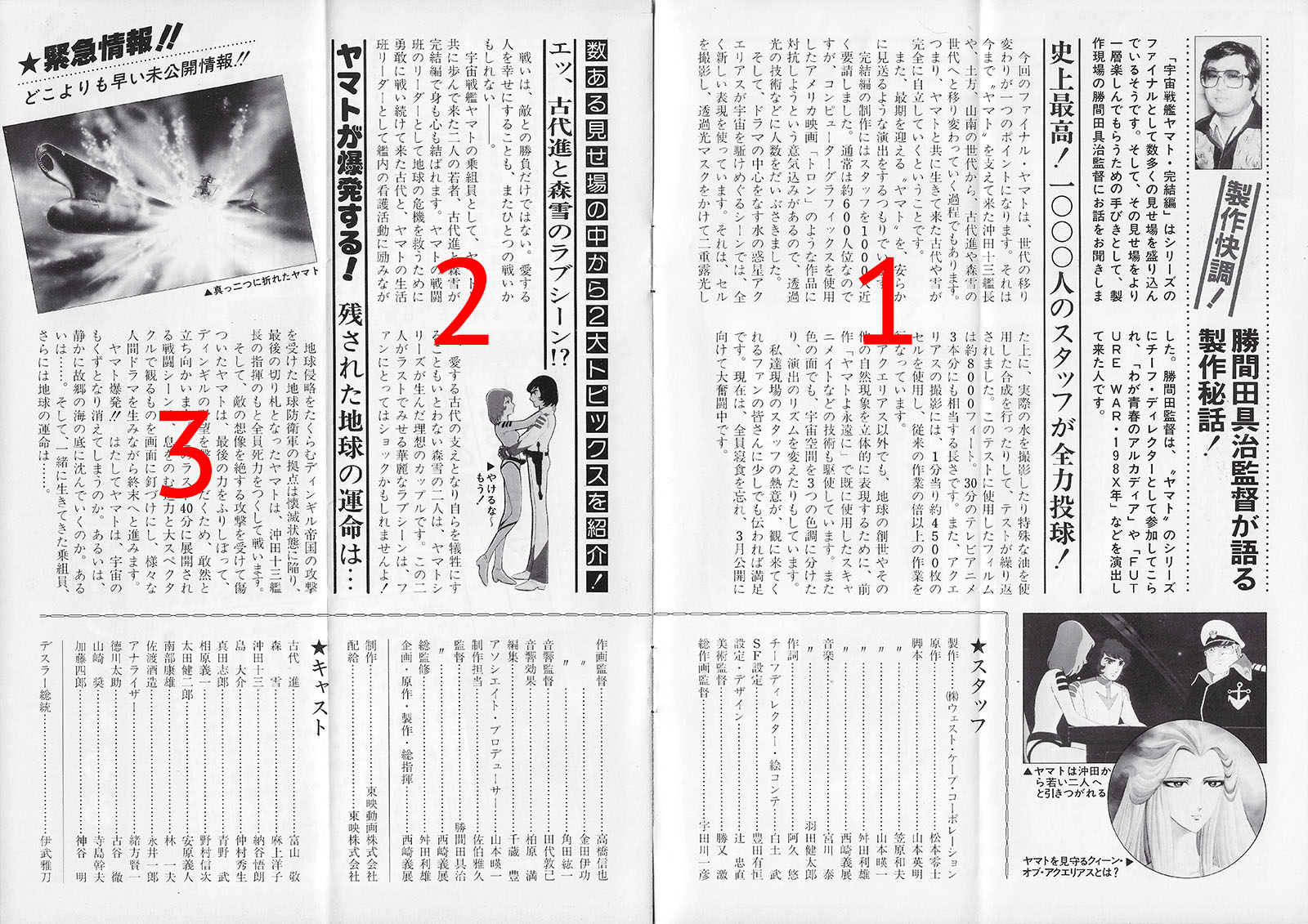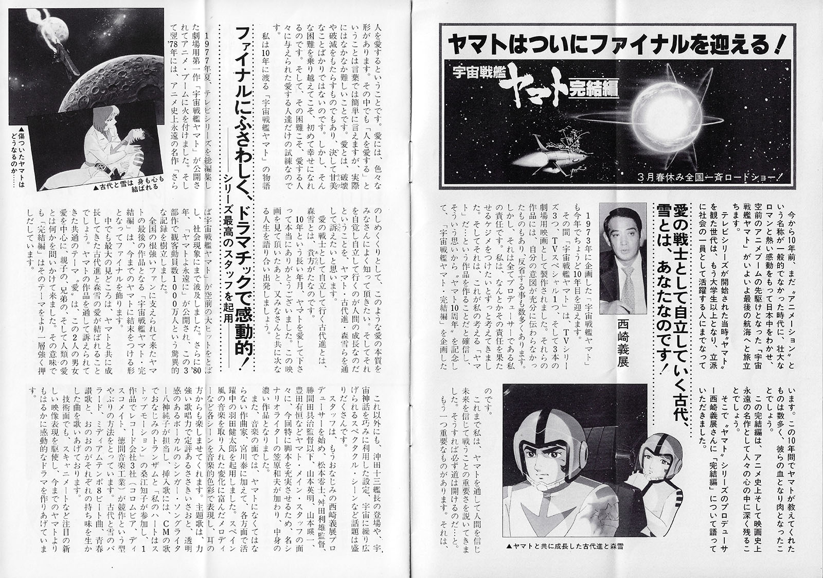 As I conclude the 10-year story of Space Battleship Yamato, I want everyone to fully understand the true essence of love. And through Yamato, Susumu Kodai, Yuki Mori, and others, I want to convey that human growth comes from realizing this and becoming independent. You are the Susumu Kodai and Yuki Mori who become independent warriors of love.