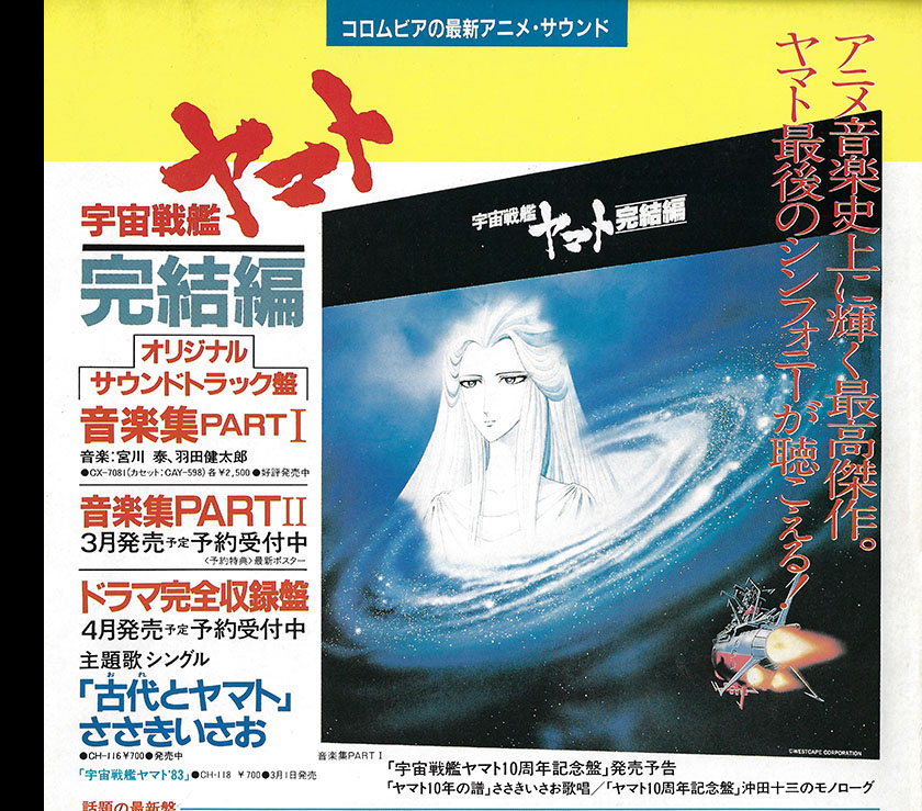 The back cover (at right) carried a new ad from Columbia Music, spotlighting the first Final Yamato Music Collection album with the promise of Part II in March and the first notice of a Drama album to be released in April.
