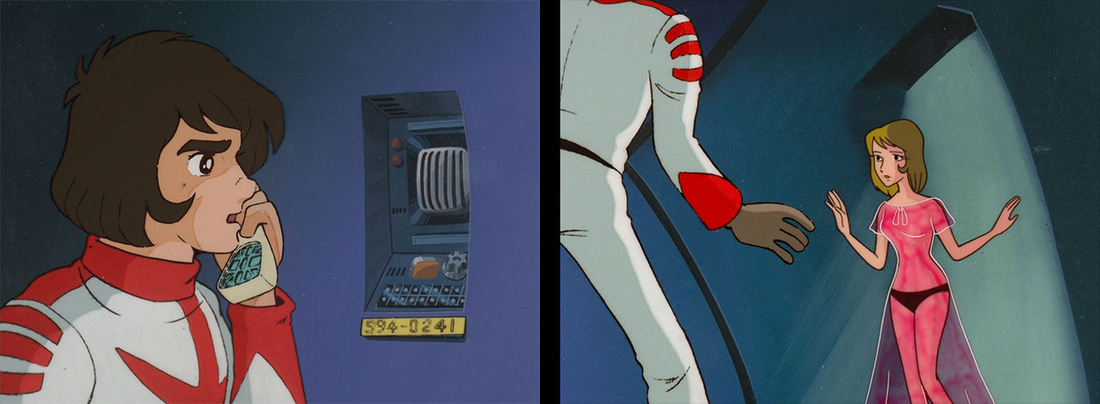 The studio distributed copies of the original artwork for the shot where Analyzer is tangled with Yuki inside the crashed exploration craft. It had blank spaces to add speech bubbles. I recently acquired the animation and cels for this exact shot, so I compared them and figured out why it was done that way. Analyzer’s arm was touching Yuki’s crotch in the original artwork. That artwork was revised, and in the final scene, the hand is moved away.
