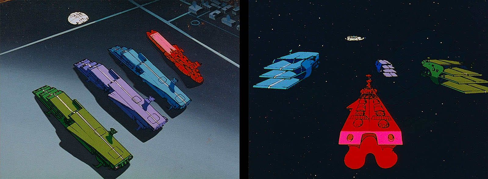 That’s right. It’s the same Earth used in the background of the theatrical poster. Did you spot it? It’s used in what’s commonly called the “A Poster.” After this, Studio Nue created the B Poster for Playcomic magazine, and later the C Poster, which further collaged cels like the Rainbow Star Cluster fleet and Kodai.