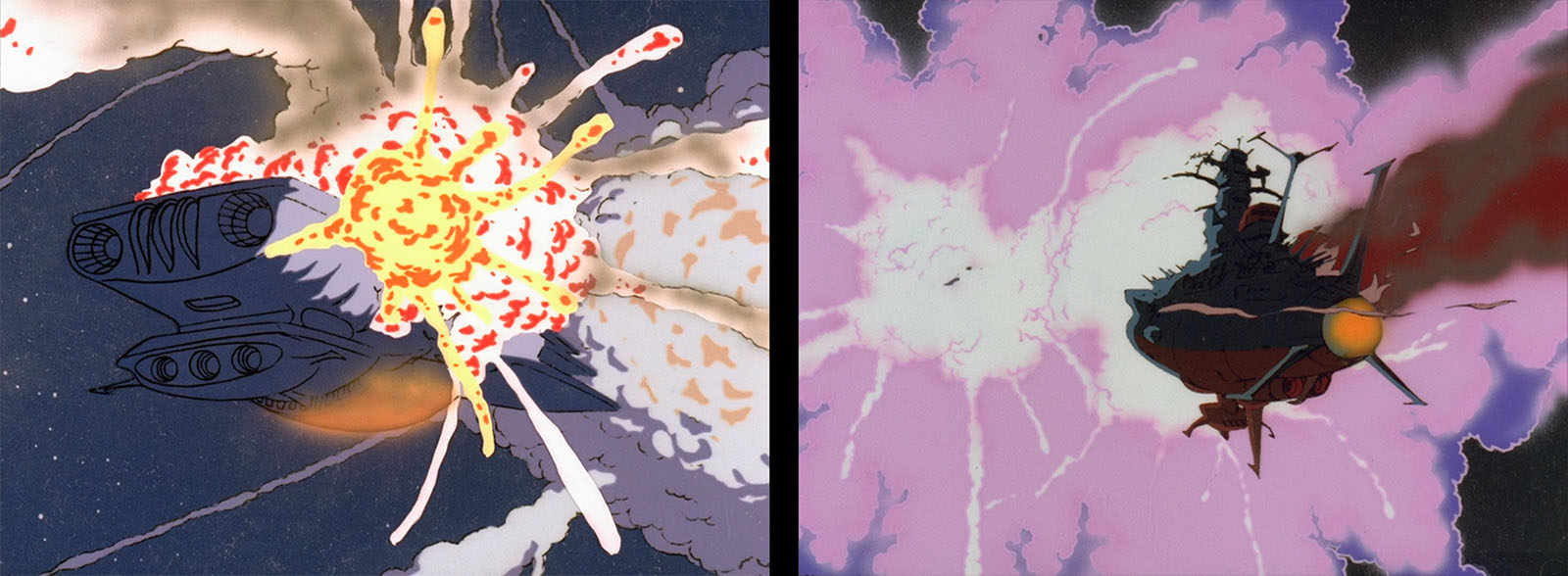 The Yamato destroyed first is prepared by Gamilas. It was created by tracing part of the usual passing bank [stock] scene, and since carbon was applied to the surface, it was a cel that didn’t deteriorate. I had that one for a while, but unfortunately it got lost.