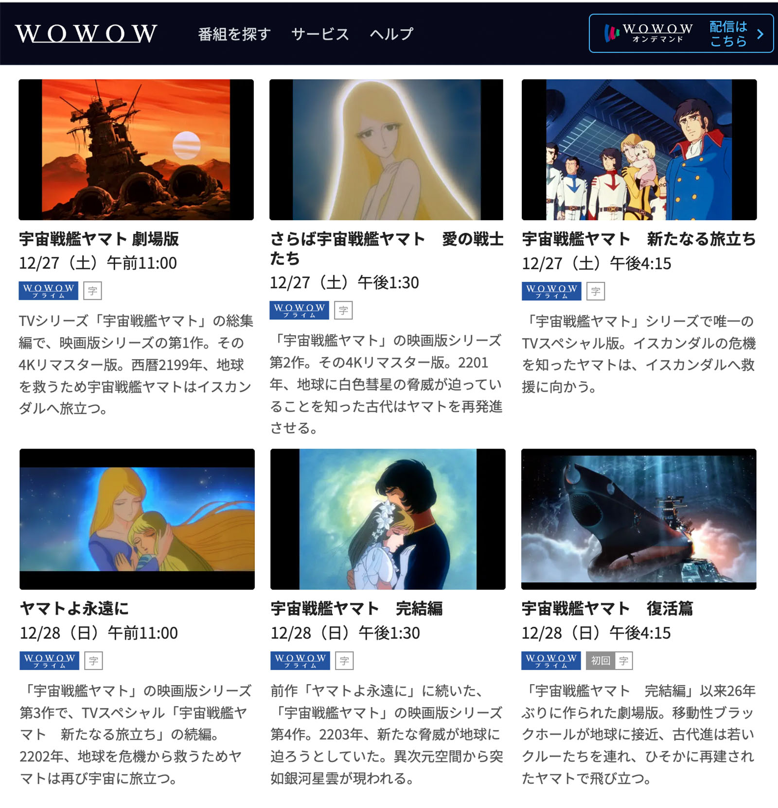 Over two days, you could watch the entire Yamato movie catalog with the first three on the 27th (the first two were 4K remasters), and the other three on the 28th. All of the Yamato programming on WOWOW was scheduled to repeat in January.