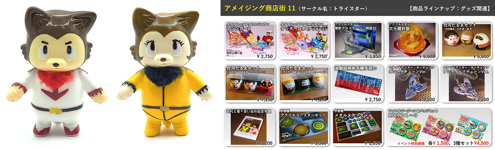 Unparalleled shopping opportunities abound in Japan, and one of those is called Amazing Shopping Street. The 11th version of this event took place at the Tokyo Metropolitan Industrial Trade Center, where various artisans assembled to sell unusual items. The soft vinyl figures above left were created by soft vinyl artist Migupiro. Also available: many of the items created for the 50th Anniversary Exhibitions by company called Tristar.