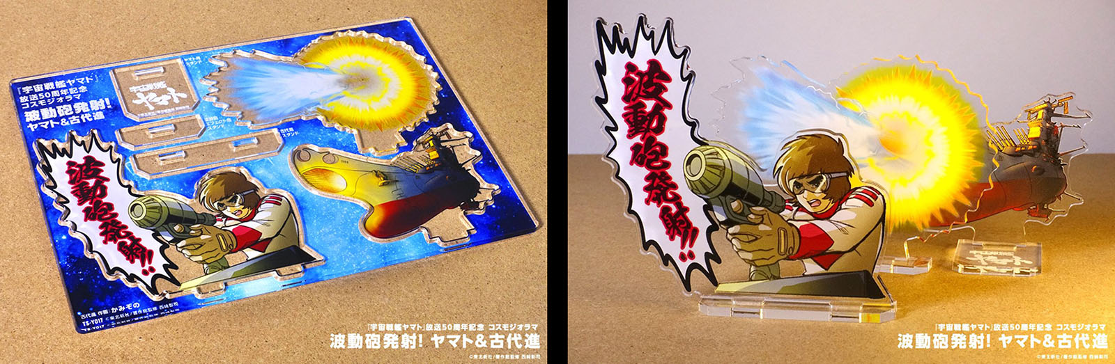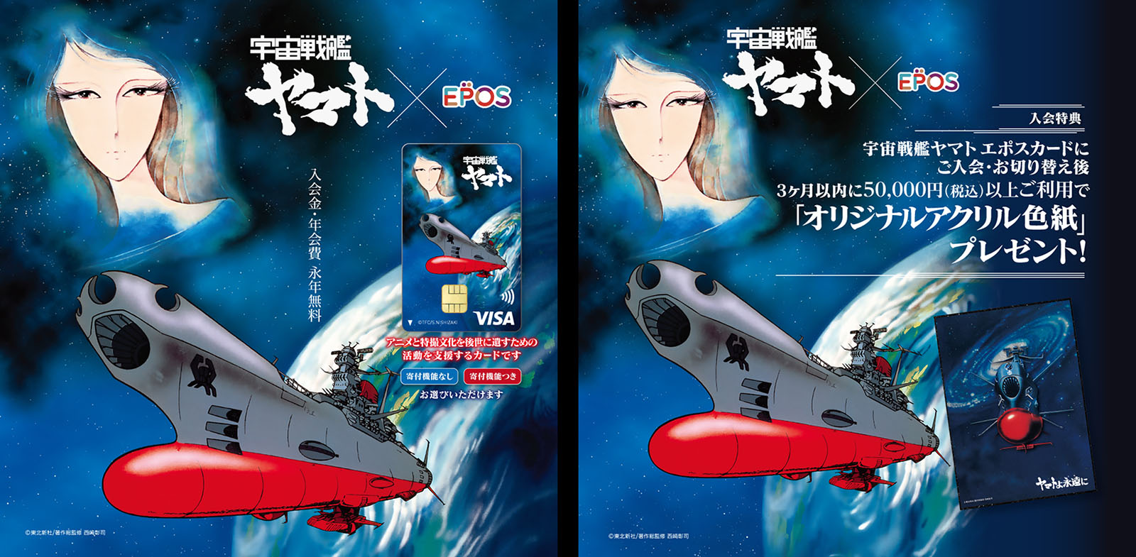 Yamato wasn’t the first anime property to appear on a credit card, but it was only a matter of time. Today the EPOS company announced that applications would open on the 23rd with no entry fees, and that 0.1% of points earned would be donated to ATAC (Anime & Tokusatsu Archive Centre). Also, an acrylic print (shown at right) was offered as an incentive for anyone to switch their previous card over to the Yamato version.