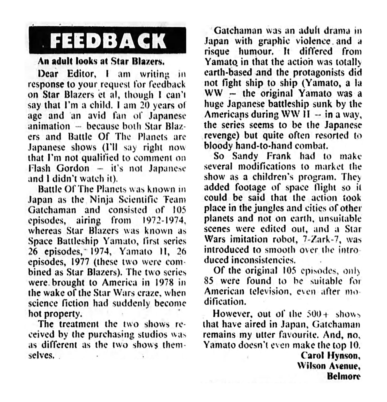 While Yamato was in a long winding-down phase in Japan, Star Blazers was still out there making TV syndication waves in the rest of the English-speaking world. This included Australia, as evidenced by this clipping from the letters column of the Sydney Morning Herald.