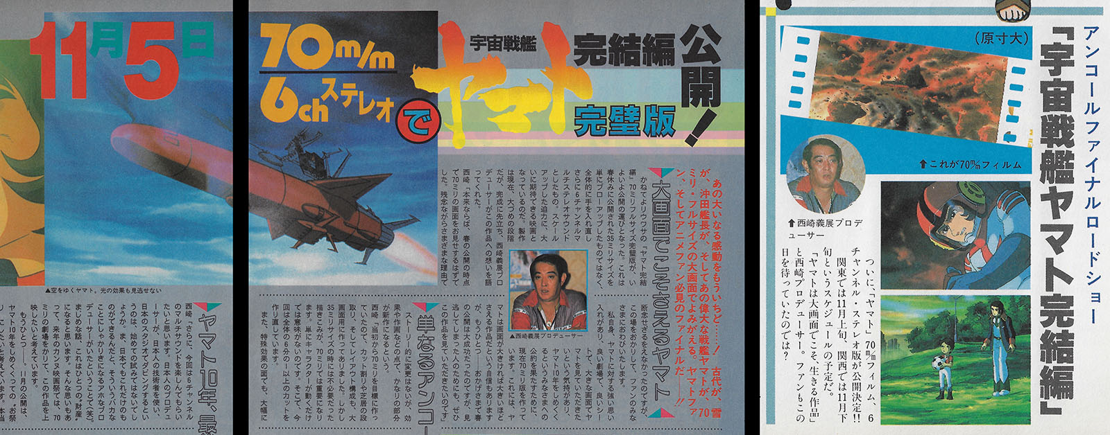 The last press gathering of the Yamato production era happened on this day when Yoshinobu Nishizaki gathered the media together to officially announce the details of the upgraded 70mm version of Final Yamato. He talked extensively about the improvements that had been made since the spring, including new footage, special effects, and sound engineering, and committed to a limited premiere date of November 5 in Tokyo and November 20 in Osaka. All the information would be communicated in magazines to be published in October (scraps shown above from The Anime and My Anime).