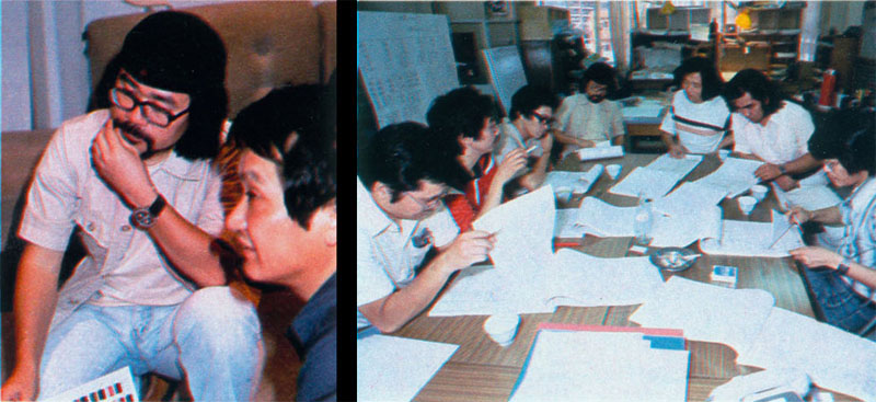 Above left: art director Ito does a color check. Above right: a meeting of General Director Yamamoto,