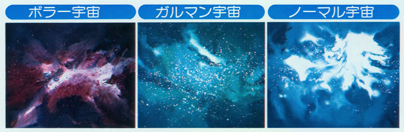 Violet-red space is the image of the Bolar Federation. Green space is the basic tone for the Galman Empire. Earth and the solar system have a normal space image.